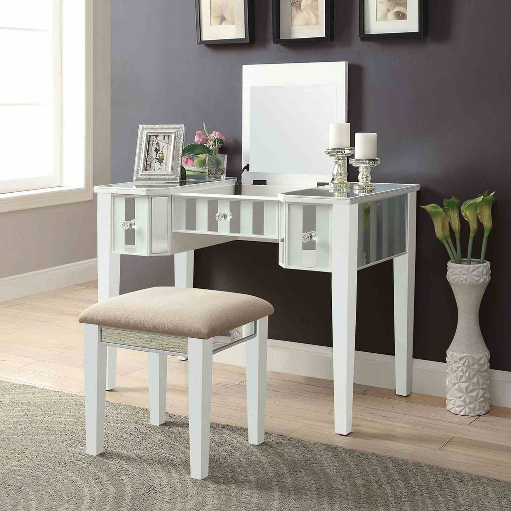 Vanities work best with large spaces. Big drawers for storage, a nice table top, multiple large mirrors for a full range of angles. Luckily this vanity features all of those. The mirrored paneling helps bring more light to your room and creates a shining beacon for you to follow and work at in the mornings. Sit at the matching padded stool and enjoy your prep time.