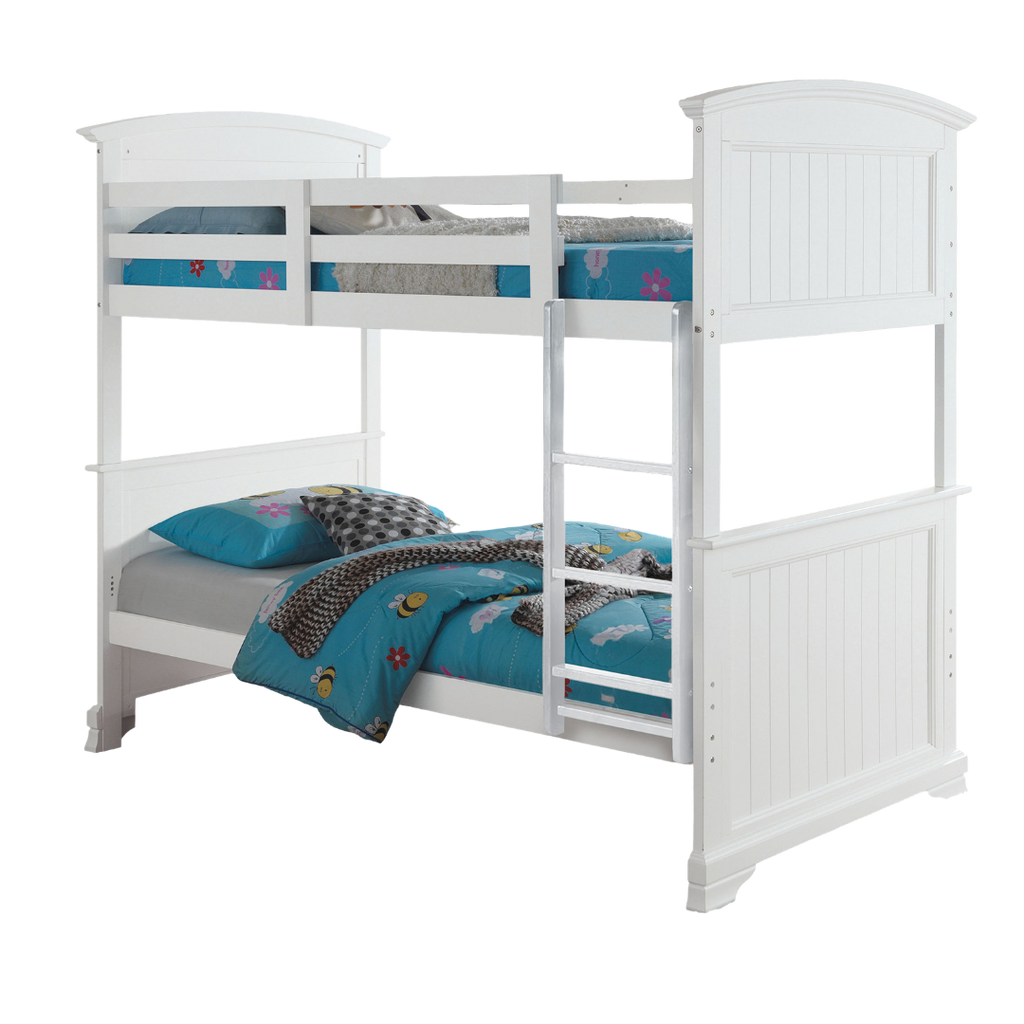 Maximize bedroom space with this elegant transitional white bunk bed, crafted from durable solid and engineered wood. Featuring a stylish panel headboard and footboard, ogee bracket feet, and a convenient reversible ladder for flexible placement. Its patented insert & lock joint system ensures stability, making it perfect for any modern home.