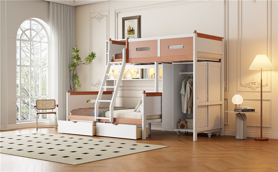Elevate your space with this Twin Over Full Wooden Bunk Bed, featuring a chic white and vibrant orange design perfect for any modern bedroom. Maximizing storage, it includes a built-in wardrobe, drawers, shelves, and LED-lit nooks for ultimate organization and convenience. Crafted for durability and style, this versatile bunk bed provides comfortable sleeping and smart storage solutions for kids, teens, or guests.