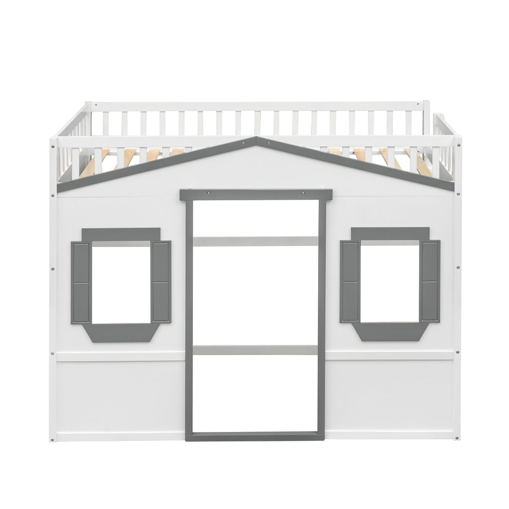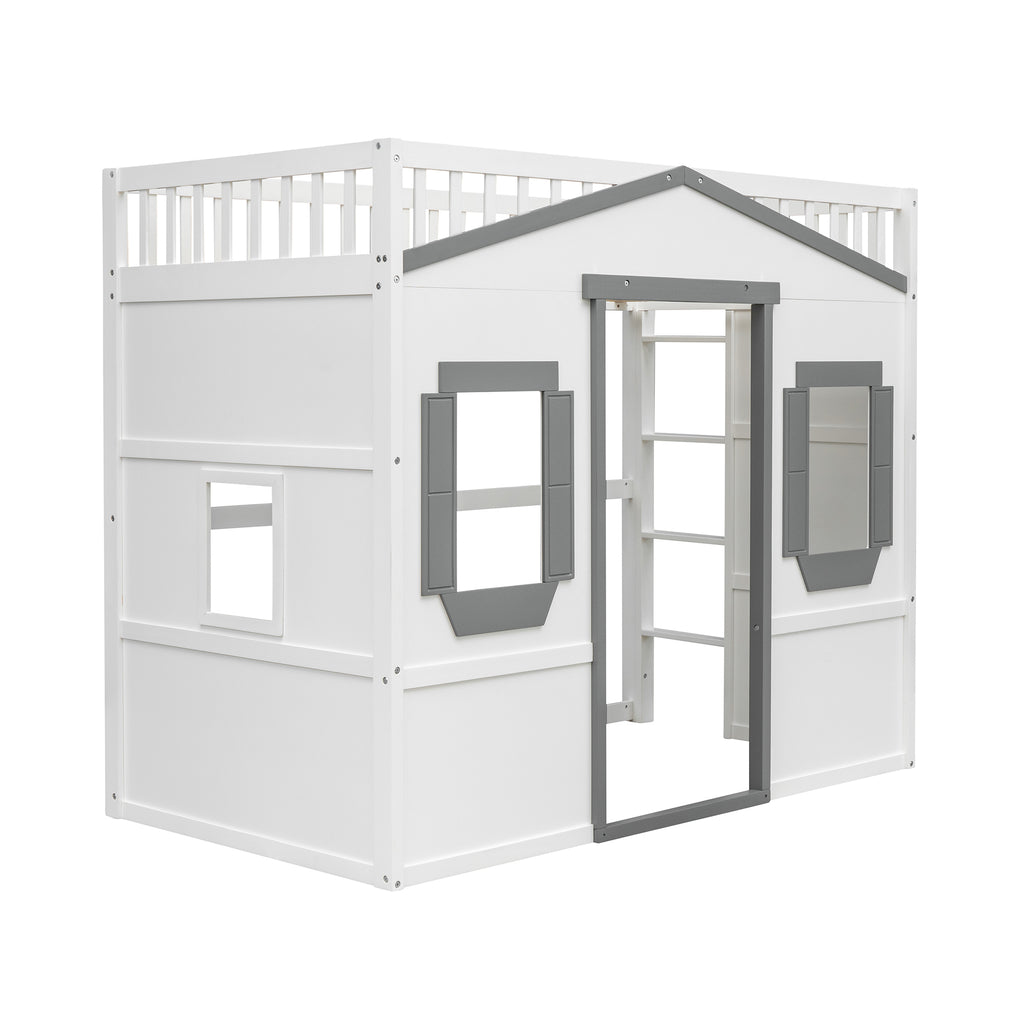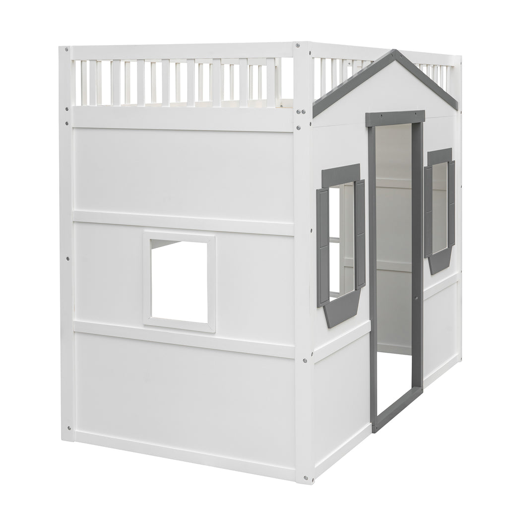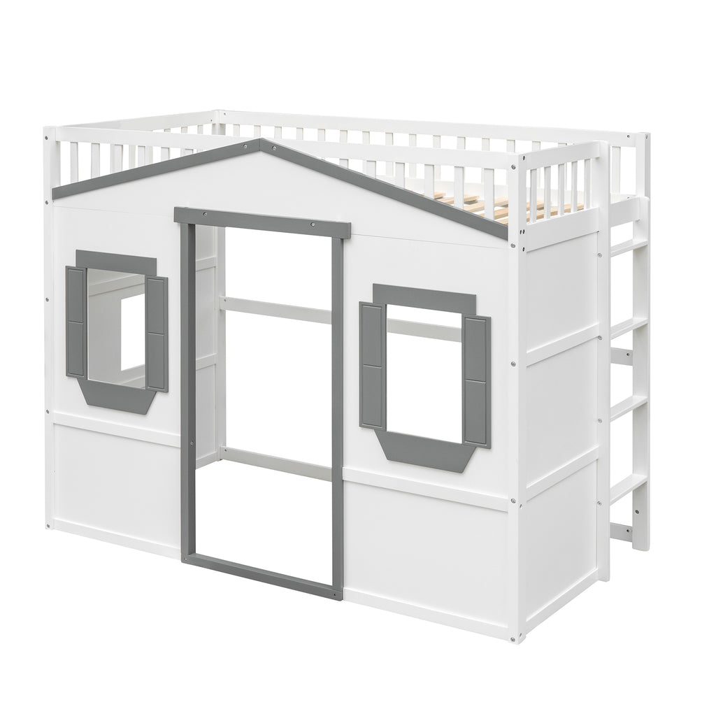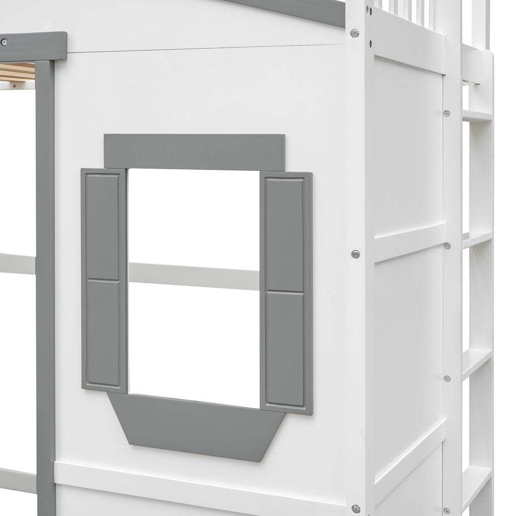 Maximize space with this elegant Twin Size Solid Wood Loft Bed, featuring a clean silhouette and durable pine construction. Enjoy superior stability and safety with sturdy guard rails and a slanted ladder, built to last for years. This versatile white+gray loft bed offers health and comfort, requiring no box spring and enhancing any bedroom decor.