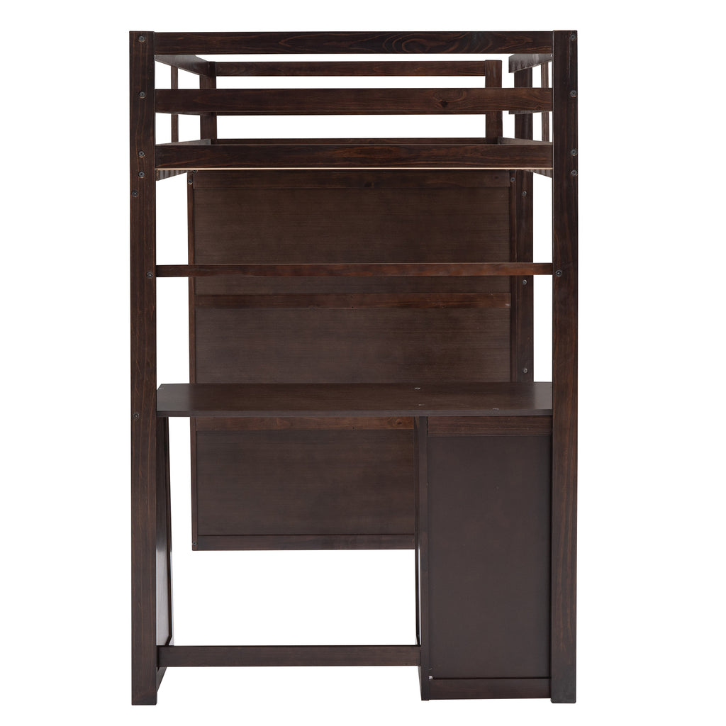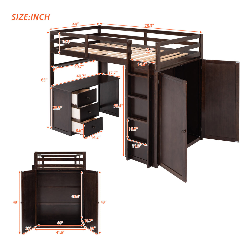 Maximize space and functionality with our Espresso Twin Solid Wood Loft Bed, featuring integrated drawers, a desk, and a wardrobe for ultimate organization. Crafted from durable pine wood and MDF, this multi-functional loft bed provides a sturdy, safe sleeping area without needing a box spring. Perfect for growing families, it combines health, comfort, and versatile design to transform any bedroom into an efficient study and rest zone.