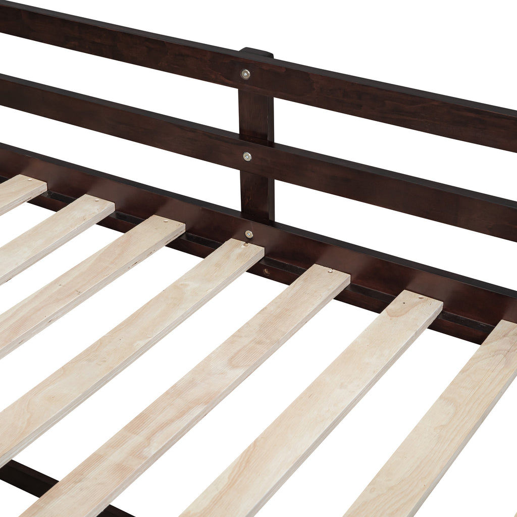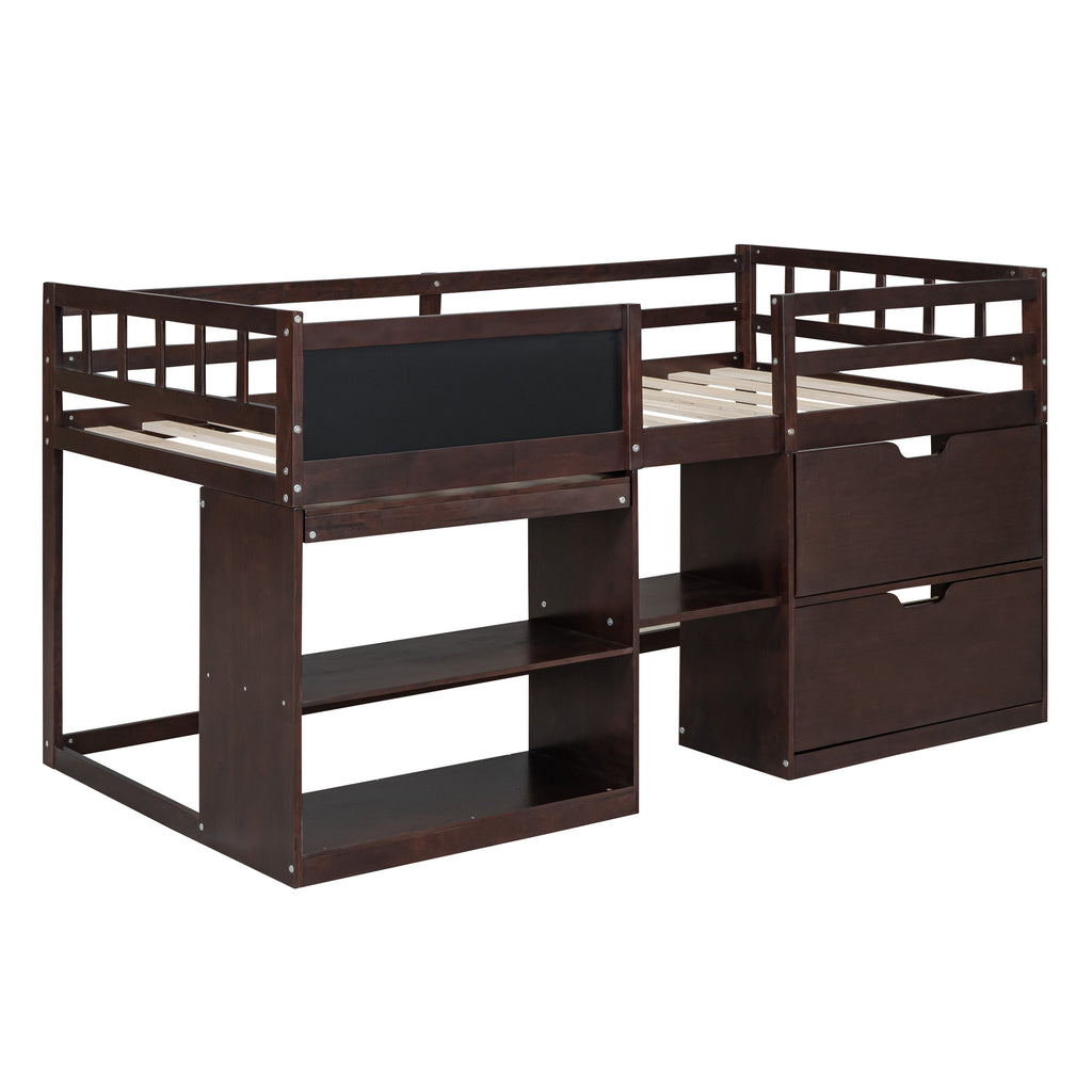 Maximize space with this Twin Size Low Loft Bed, expertly crafted from solid pine wood in a rich Espresso finish. Featuring a convenient rolling desk, integrated two-tier bookshelf, and ample storage drawers, it's perfect for organization and creativity. Enjoy secure, durable construction with full-length guardrails for lasting peace of mind.