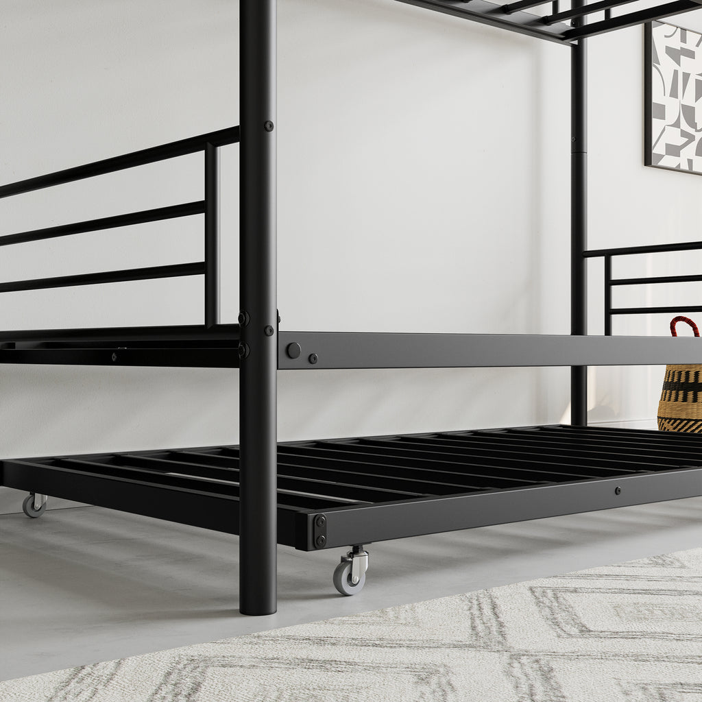 - Heavy Duty Bunk Bed: This twin size metal bunk bed frame is made of heavy duty steel and a rust-resistant powder coating, which provides sturdiness and durability. 300lbs of upper bed ,400lbs of bottom bed,250lbs of twin size trundle bed.