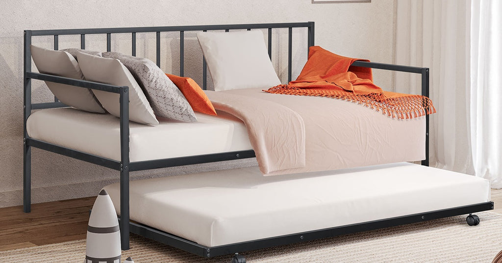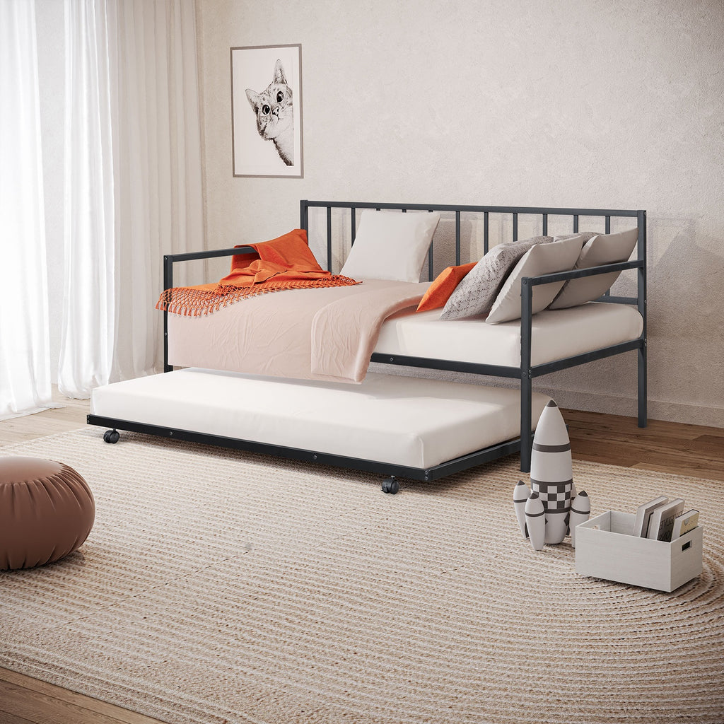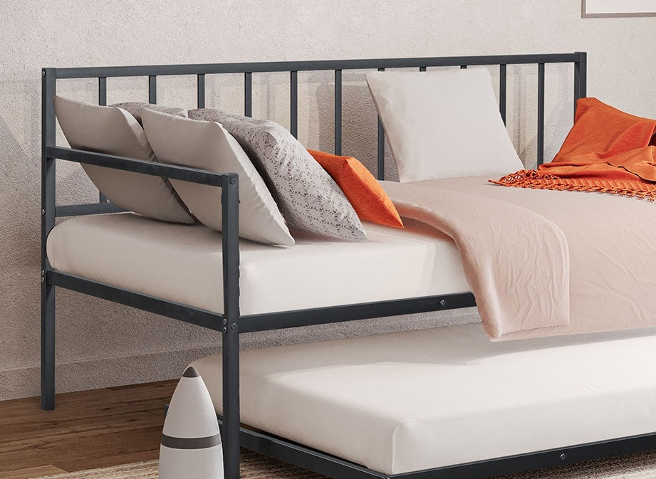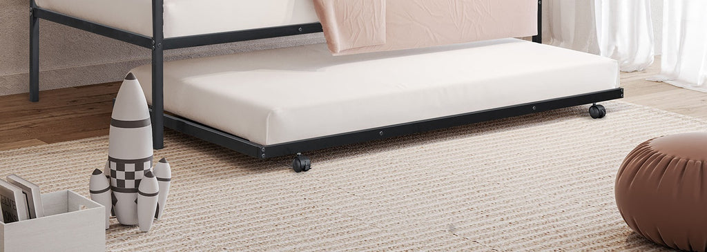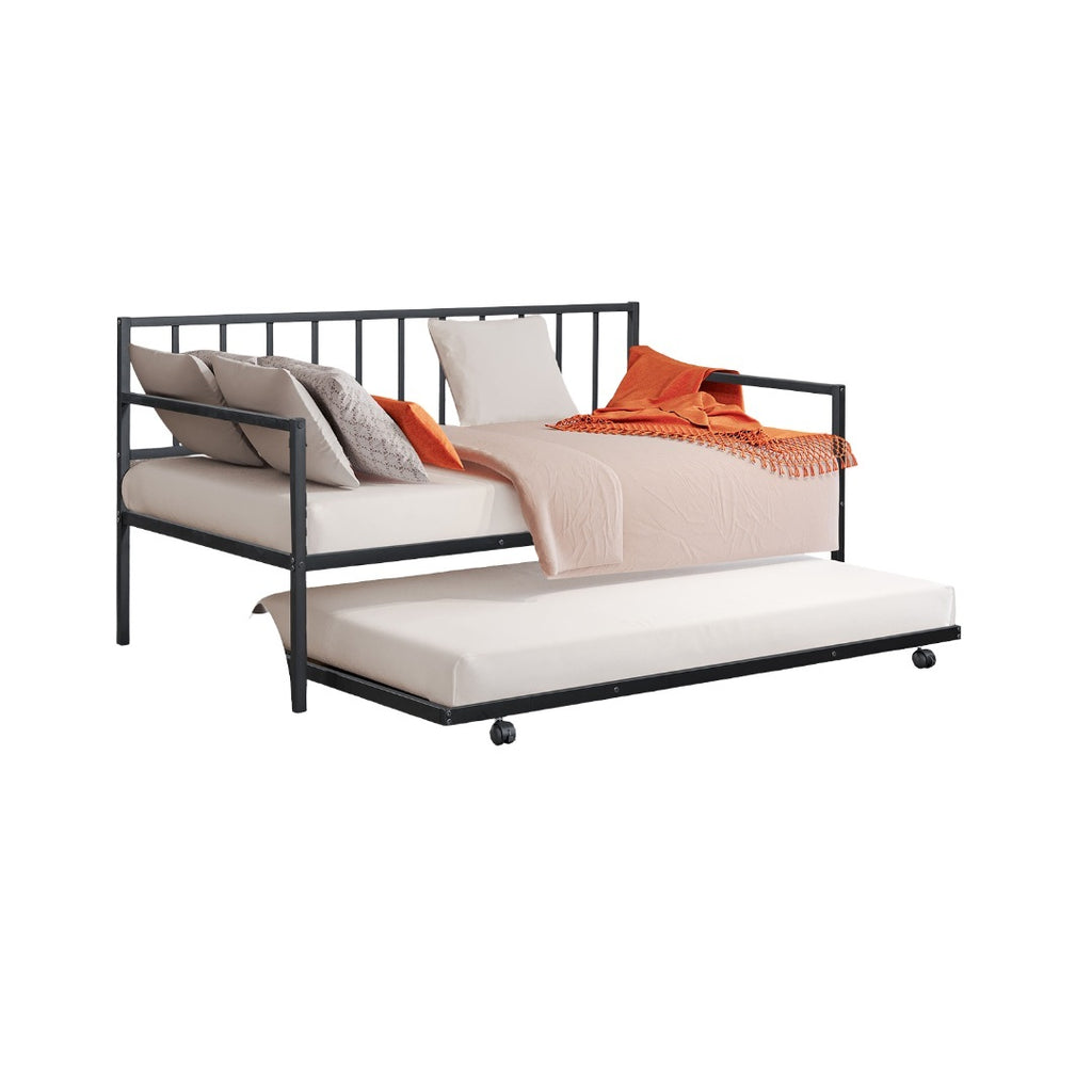 Contemporary, sleek black metal daybed with a built-in trundle beneath. Black metal frame, clean and minimalist styling.