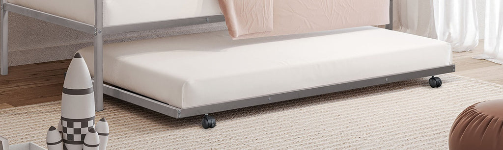 Contemporary, sleek silver metal daybed with a built-in trundle beneath. Black metal frame, clean and minimalist styling.
