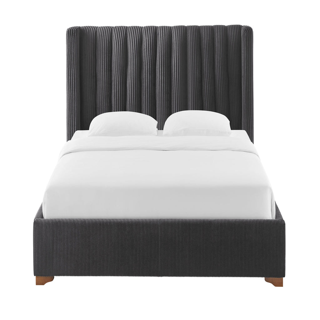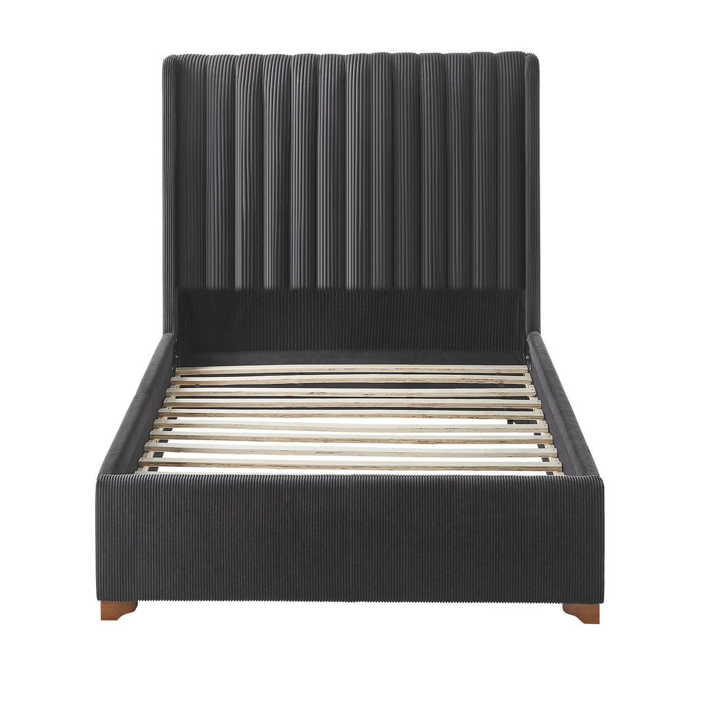 Elevate your bedroom with this modern black corduroy twin bed frame, featuring a chic wingback design and skin-friendly upholstery for ultimate comfort. Enjoy superior mattress support from durable rubber plywood slats, eliminating the need for a box spring. Its easy assembly and plush, high-resilience headboard make it perfect for relaxing and stylish living.