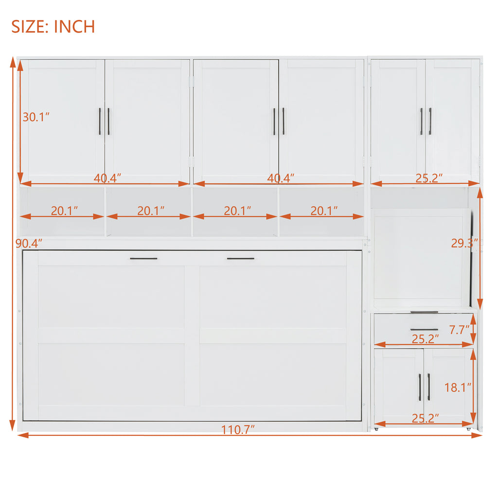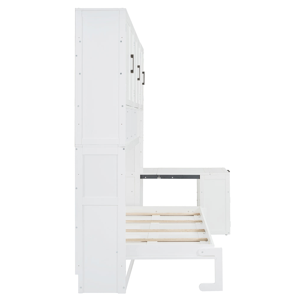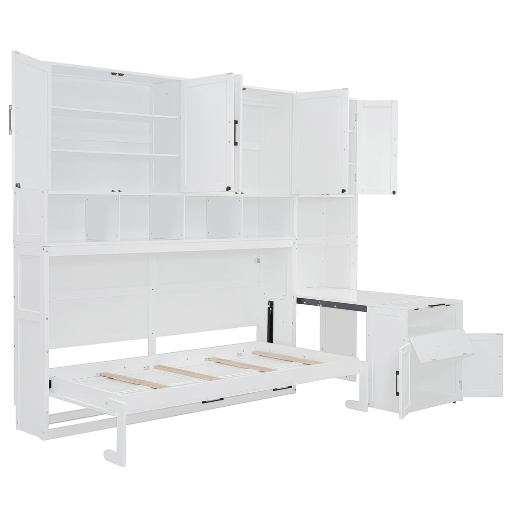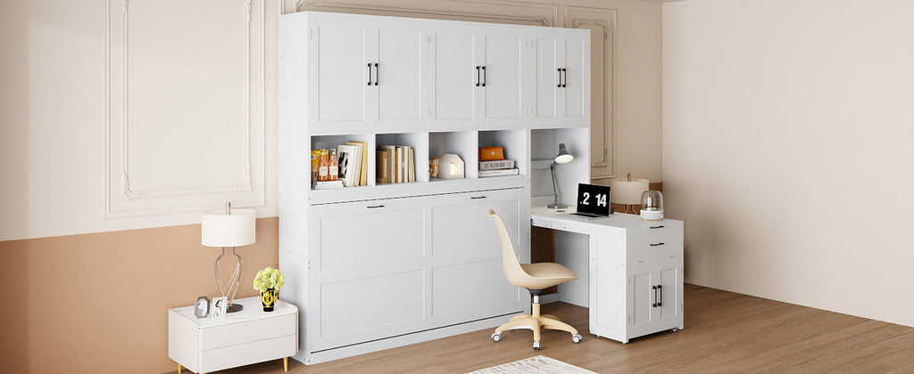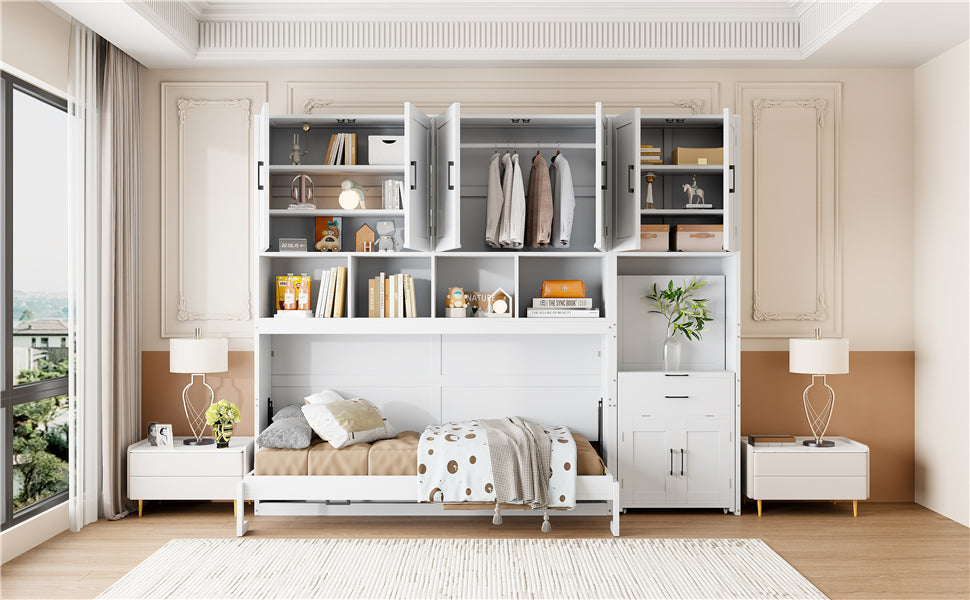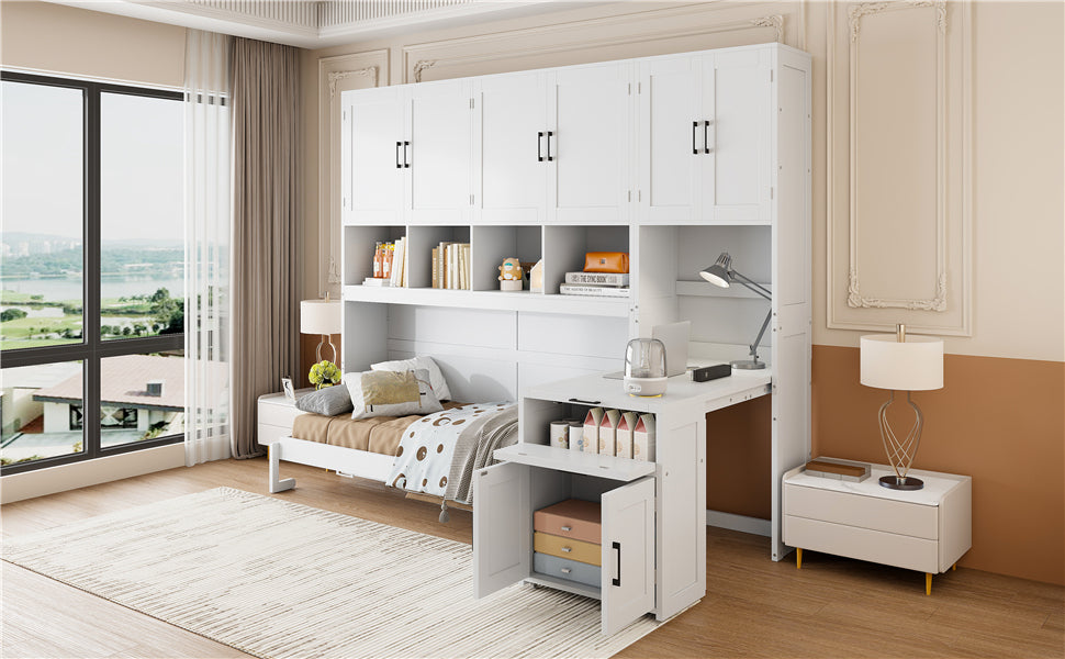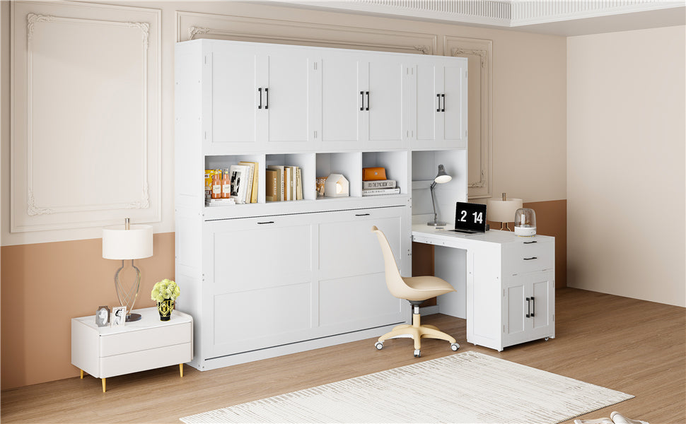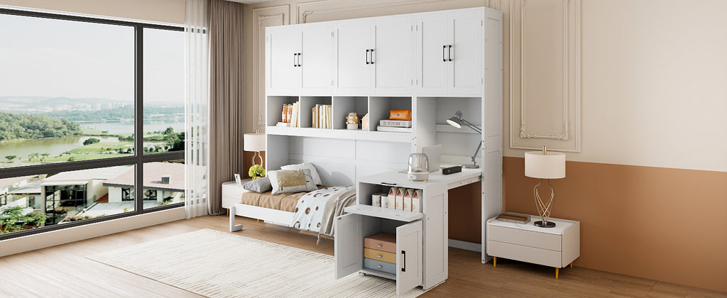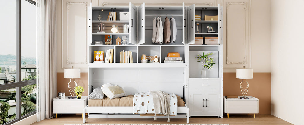 Maximize your living space with our Twin Murphy Bed, expertly designed in white MDF+LVL for seamless integration and sleek style. Featuring integrated storage like a top shelf, side wardrobe, and drawers, it keeps your room impeccably organized and clutter-free. Enjoy customizable configuration and a robust 400lbs capacity, making this a versatile and elegant solution for any modern home.
