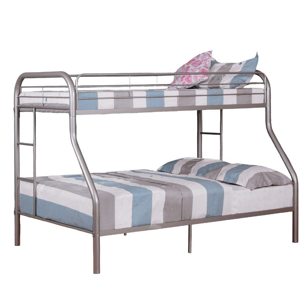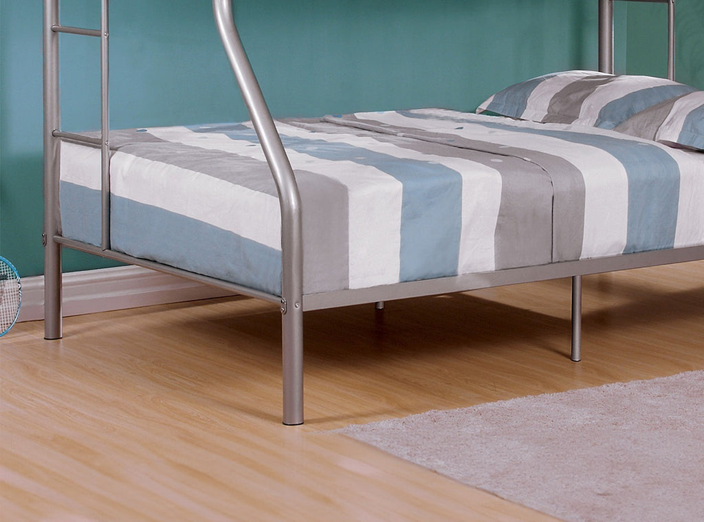 Twin-over-Full metal bunk bed in glossy silver finish. It features a sturdy full-metal frame with an integrated side ladder and is ‘mattress-ready' maximizing sleep space in contemporary or youth bedrooms.