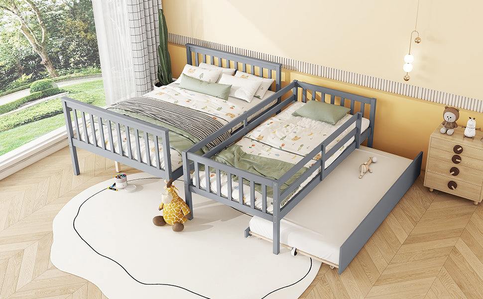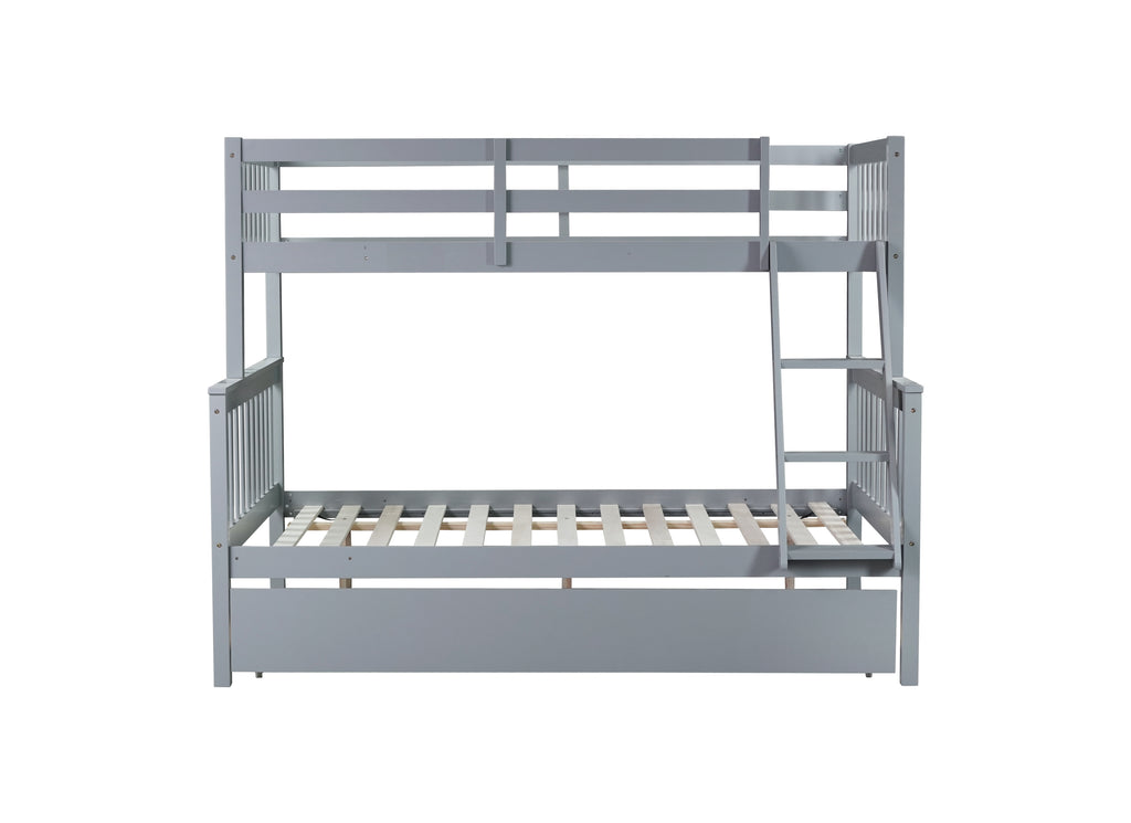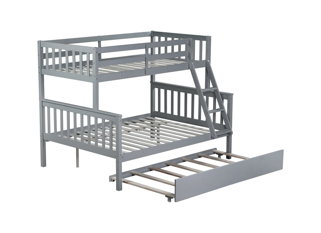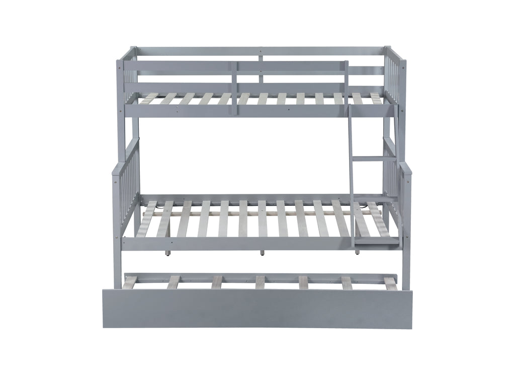 Maximize space and versatility with our Grey Twin Over Full Bunk Bed, crafted from durable rubber wood and featuring a convenient pull-out trundle for guests. This detachable design offers two separate beds or a bunk, adapting seamlessly to your evolving needs. Engineered for safety with strong guardrails and a reversible ladder, it's the perfect stylish and secure solution for any bedroom.