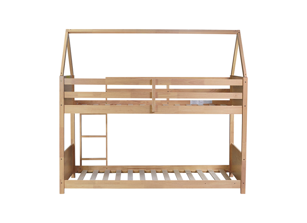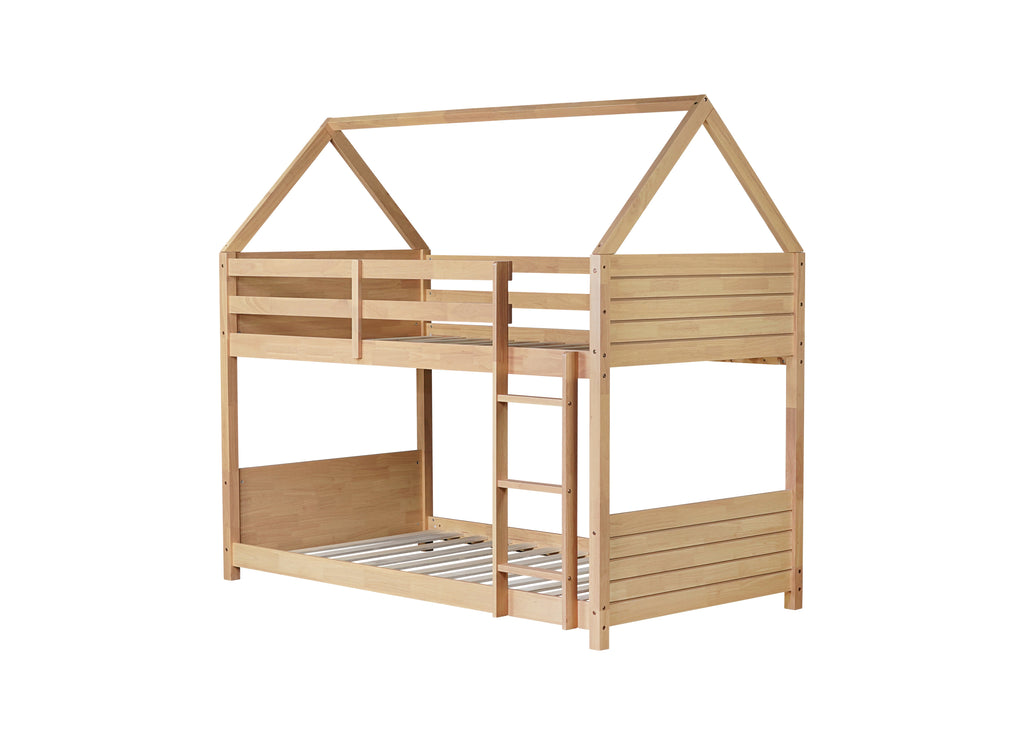 - #1 [Wooden House-shaped Bed]The unique design of wooden house bunk bed with fantastic roof construction, provides kids with a joyful access to the natural and rustic woods, while they go to bed and fall asleep. Various decorations and accessories can be hung or suspended on the roof frame to accompany the whole sleep and daily activities.