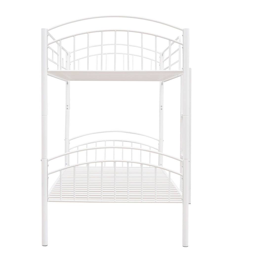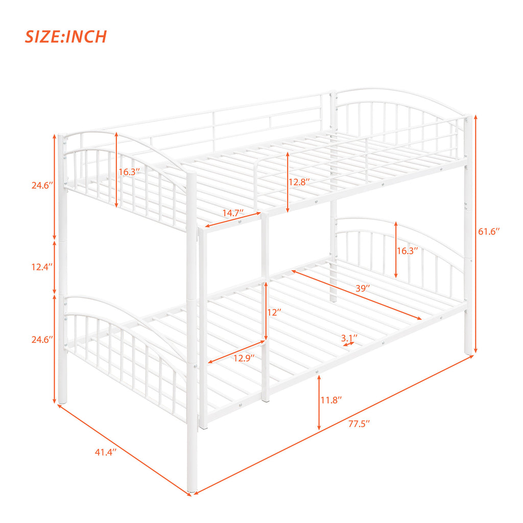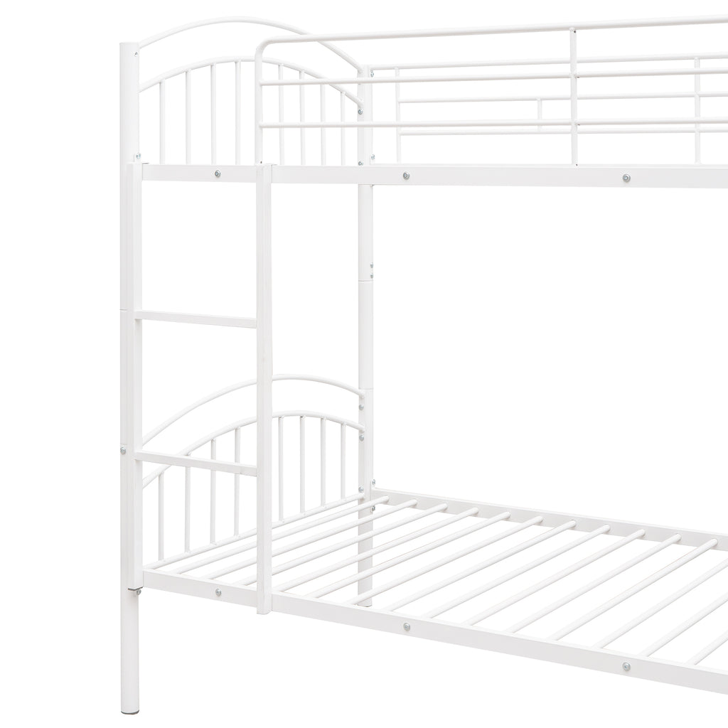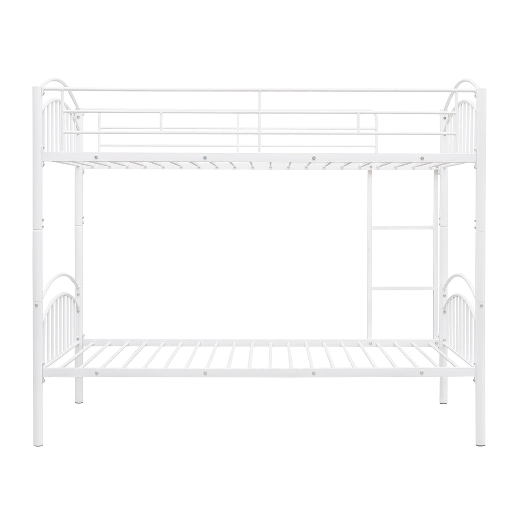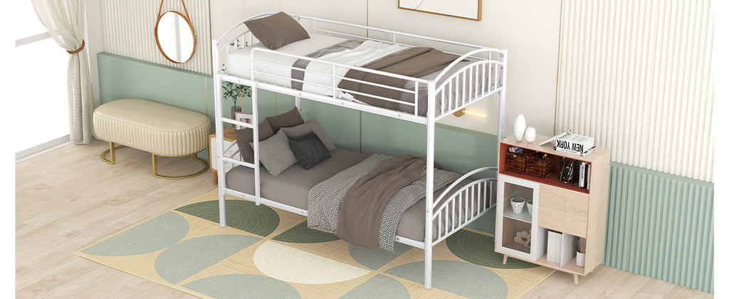 Maximize space with this versatile Twin-Over-Twin Metal Bunk Bed, featuring sturdy steel construction and a durable white finish – no box spring needed! Designed for safety with guardrails, this bunk bed offers solid support and can easily convert into two separate twin beds. Perfect for growing families, its sleek, modern design brings both style and functionality to any bedroom.