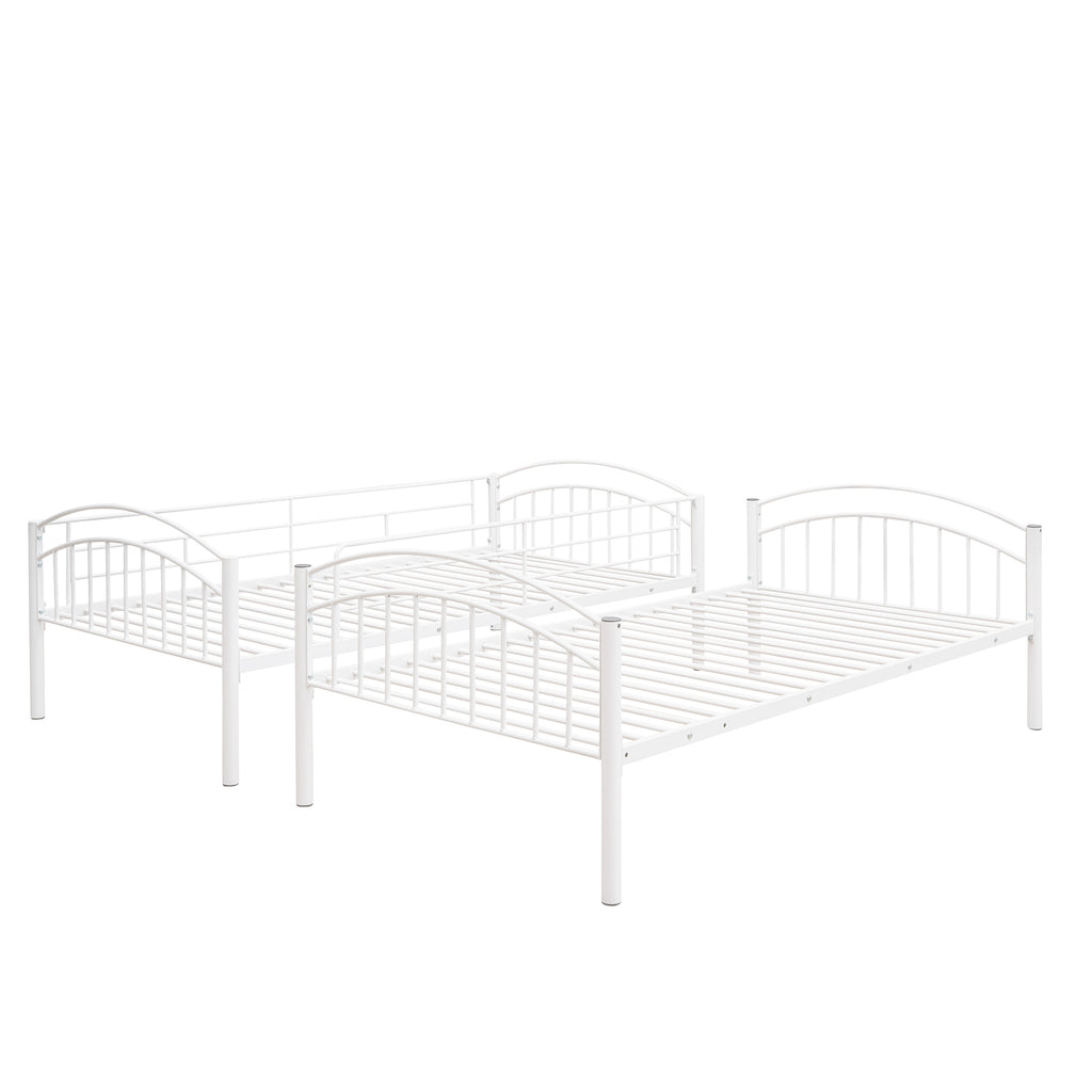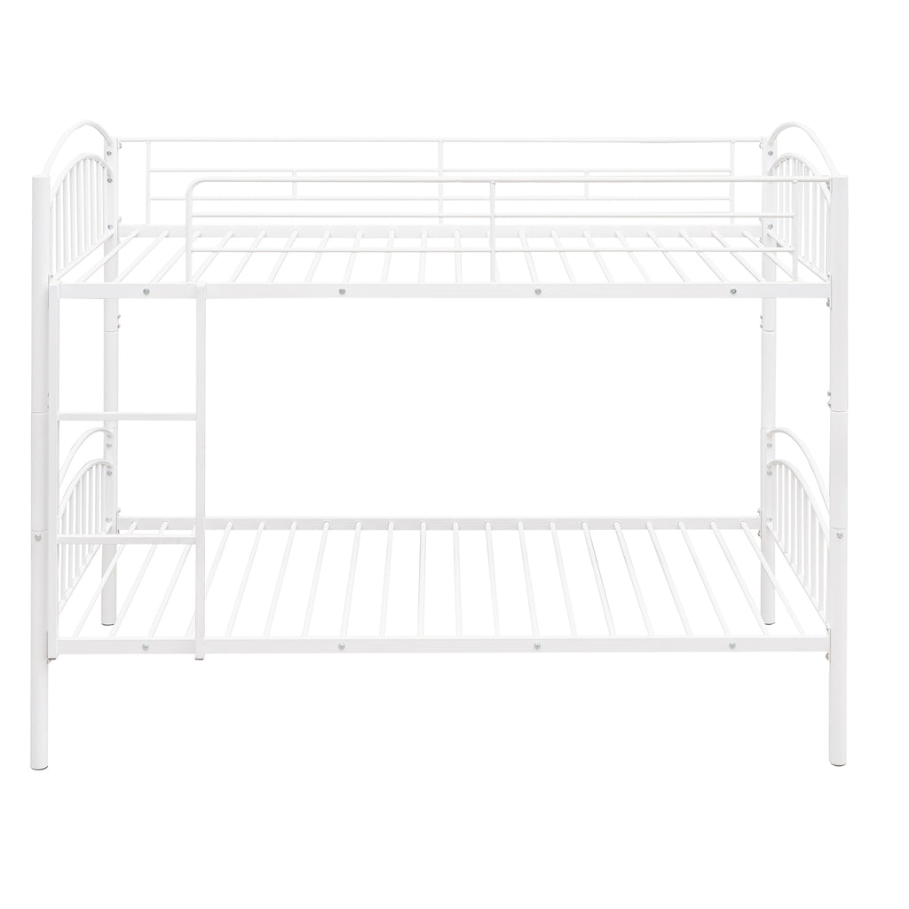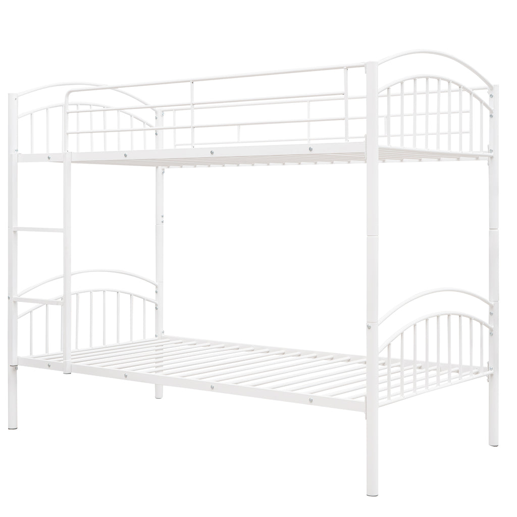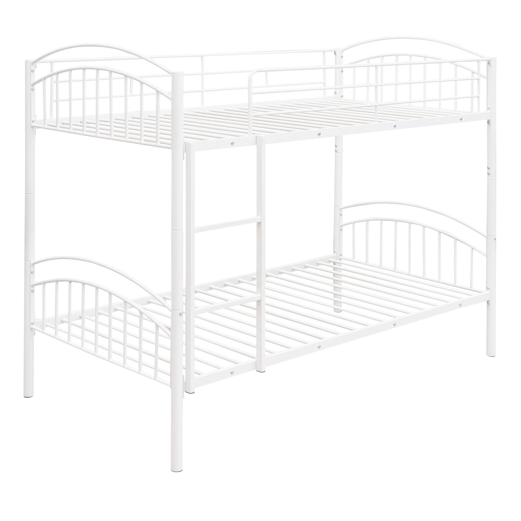 Maximize space with this versatile Twin-Over-Twin Metal Bunk Bed, featuring sturdy steel construction and a durable white finish – no box spring needed! Designed for safety with guardrails, this bunk bed offers solid support and can easily convert into two separate twin beds. Perfect for growing families, its sleek, modern design brings both style and functionality to any bedroom.