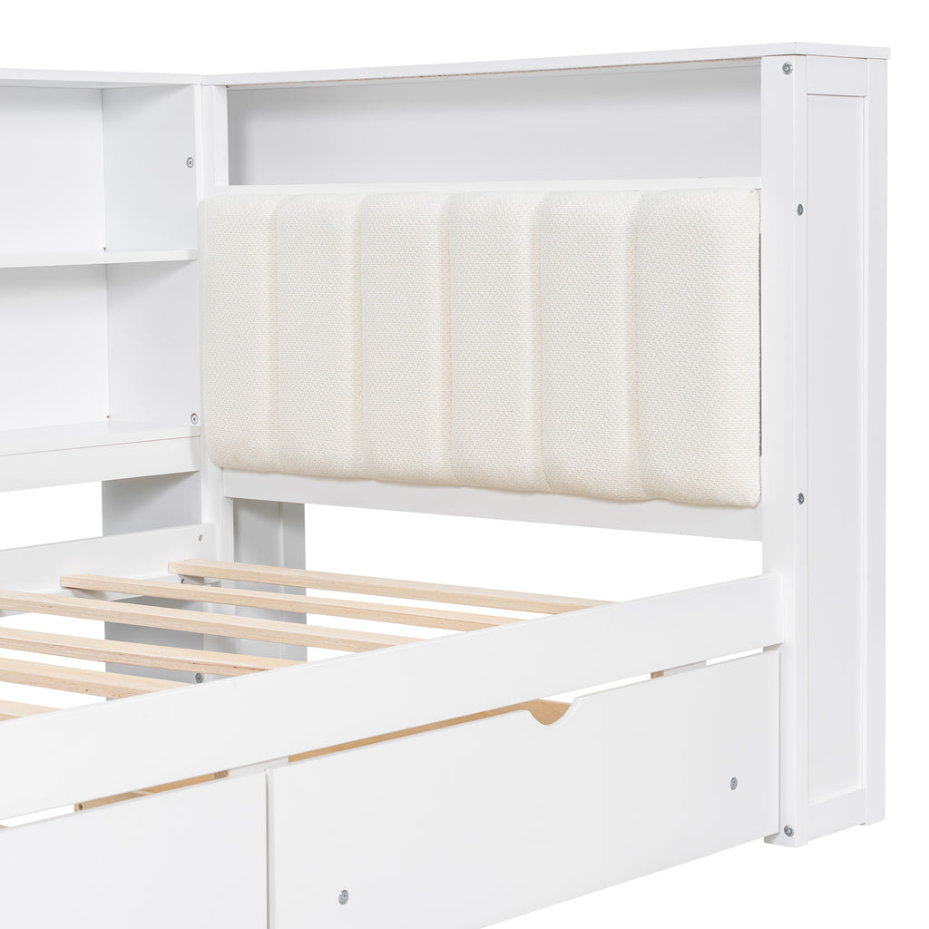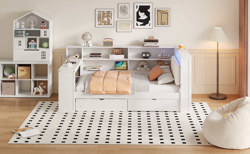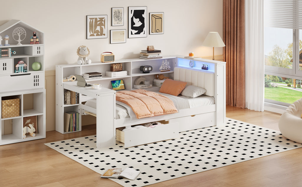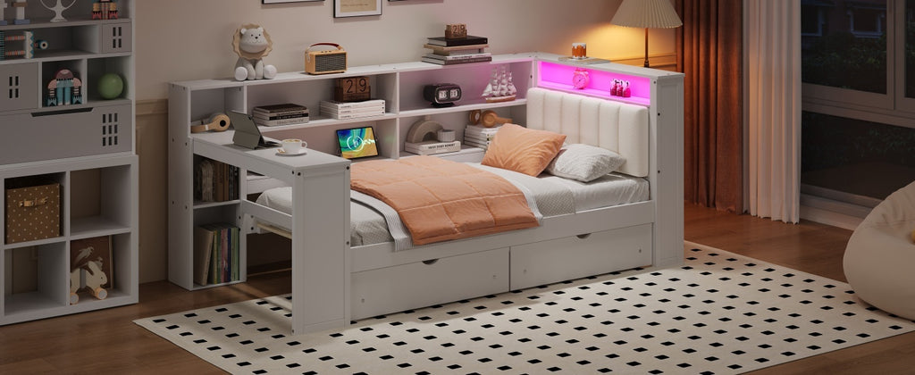 Maximize bedroom functionality with this Wood Twin Size Platform Bed, featuring an upholstered LED headboard for comfort and ambiance. Enjoy ample storage from 8 shelves and 2 drawers, plus a convenient charging station with USB ports for all your devices. A built-in desk adds versatility, making this beige and white bed the ultimate space-saving solution for any modern bedroom.