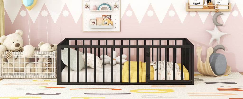 - [Fun Design]This metal floor bed frame has a circle of fences.There is a small door that can be opened and closed, which increases the interest of the bed and creates a more safety sleeping space.