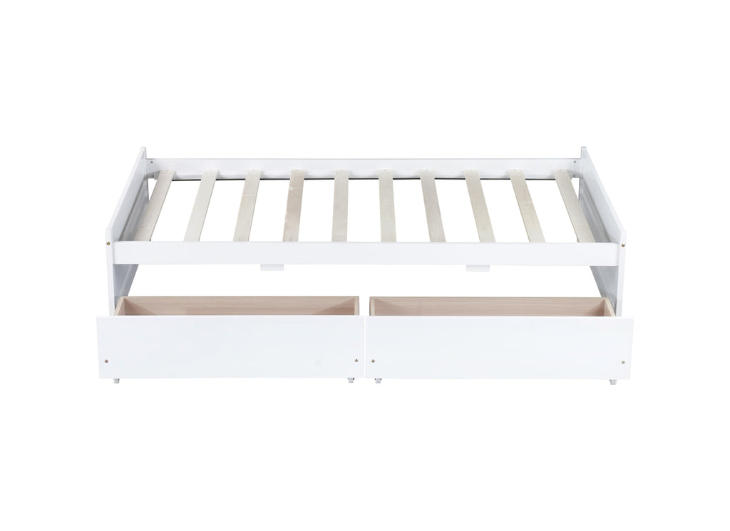 - [Safety and Quality Guaranteed[Spacious Storage] The twin bed is equipped with 2 capacious drawers, this design fully explores the options to optimize space-saving. The drawers provide ample room for storage of clothes, pillows, to] This twin bed is crafted from quality pine wood, providing lasting sturdiness and durability. The bed is constructed with firmly secured structure, forging solid stability that ensures supremely comfortable and supportive experience when users are sleeping restfully.
