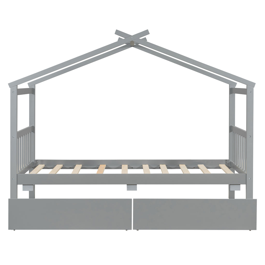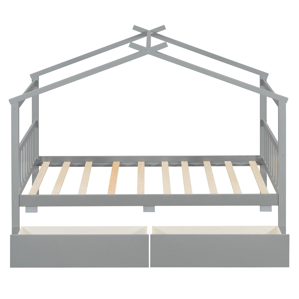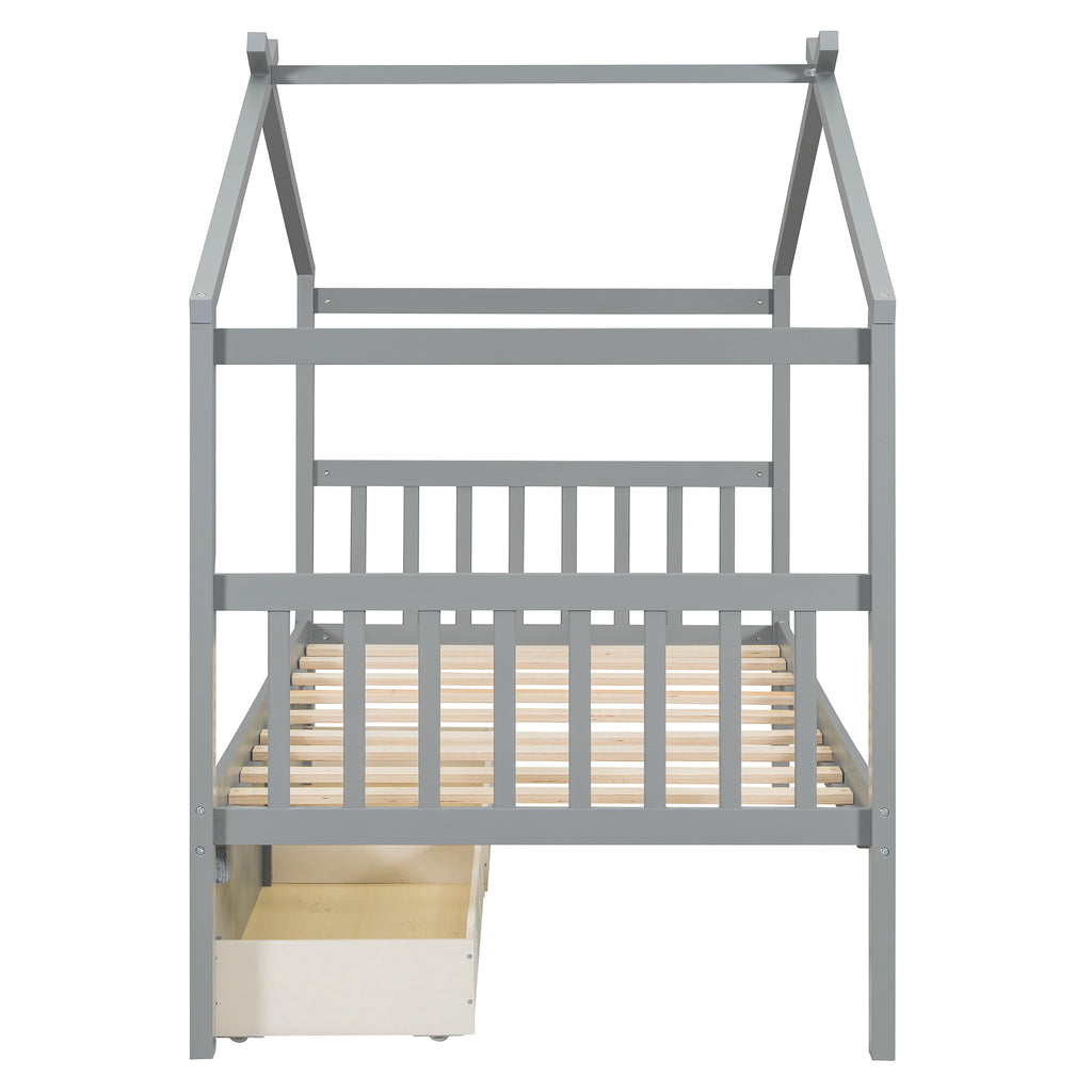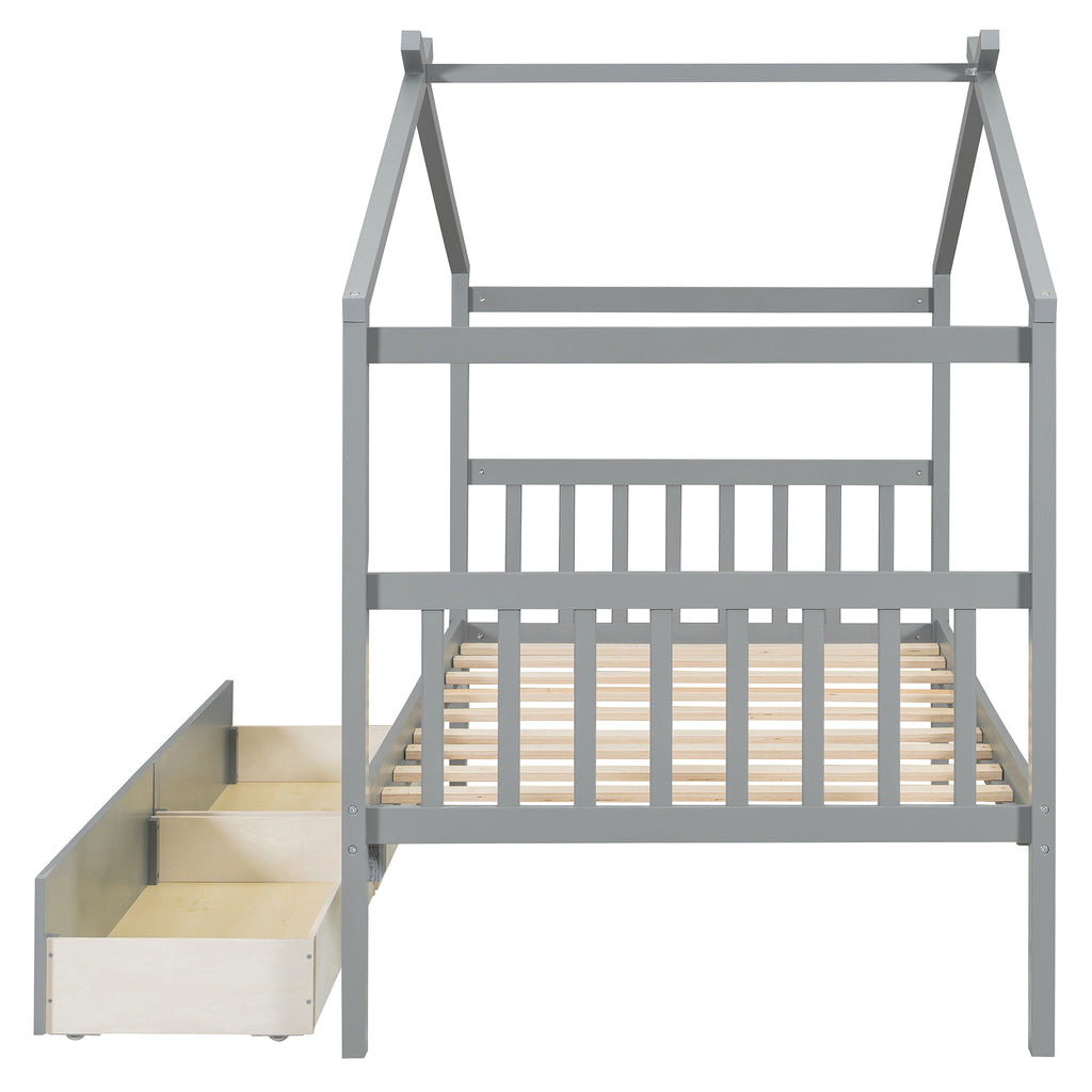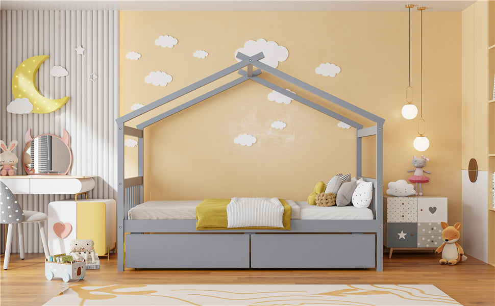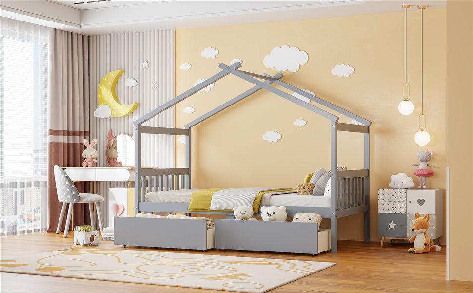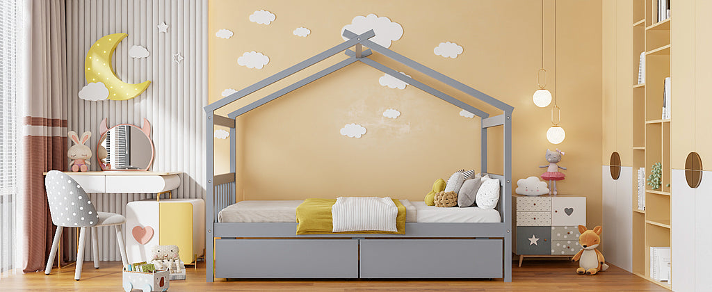 Transform your child's room with this enchanting Twin Size Wooden House Bed, featuring a whimsical house-shaped roof perfect for imaginative play and personal decoration. Crafted from solid pine wood, this durable gray platform bed includes two spacious drawers, offering essential storage to keep rooms tidy and clutter-free. Enjoy peace of mind with its sturdy construction and included headboards, ensuring a safe and comfortable sleeping environment for years to come.