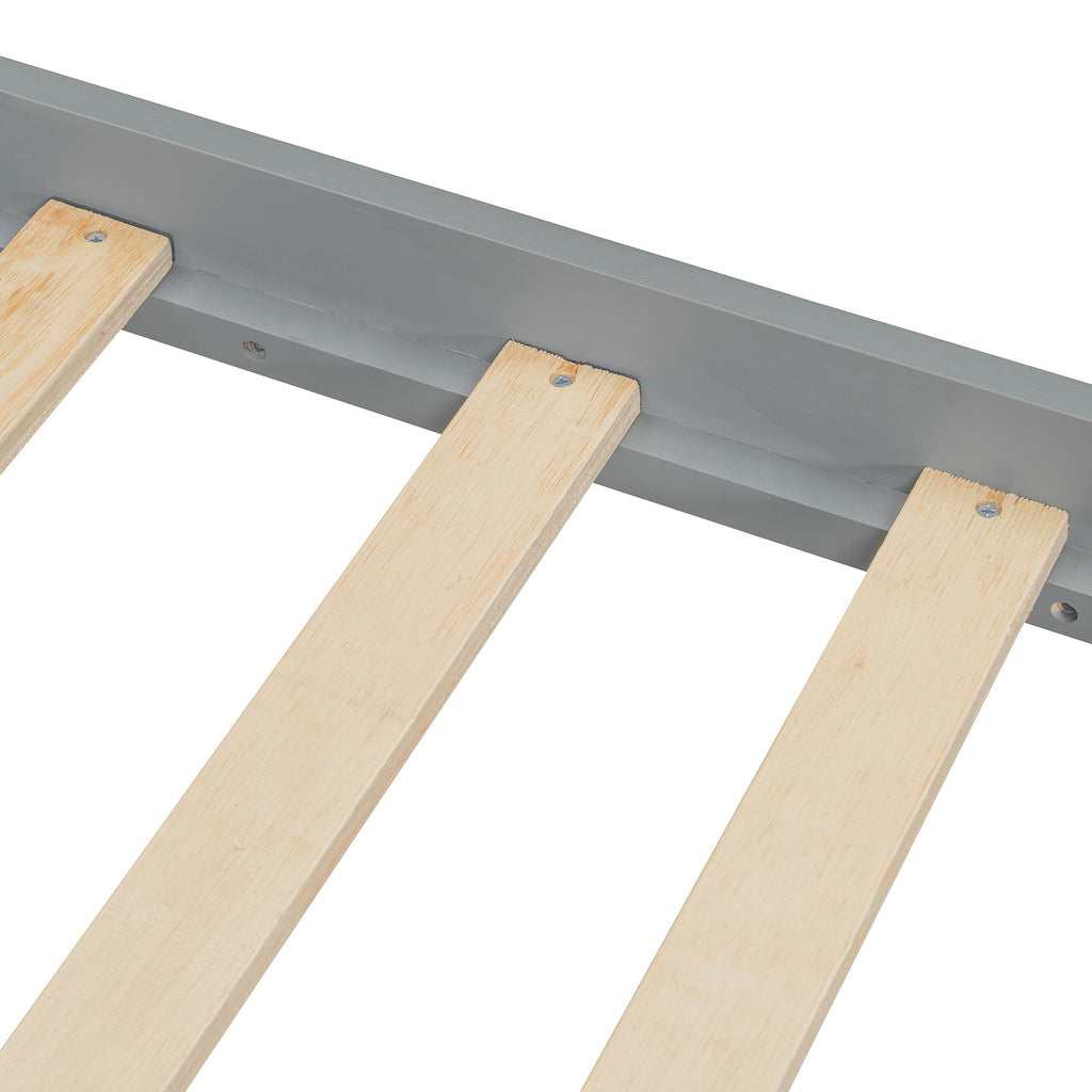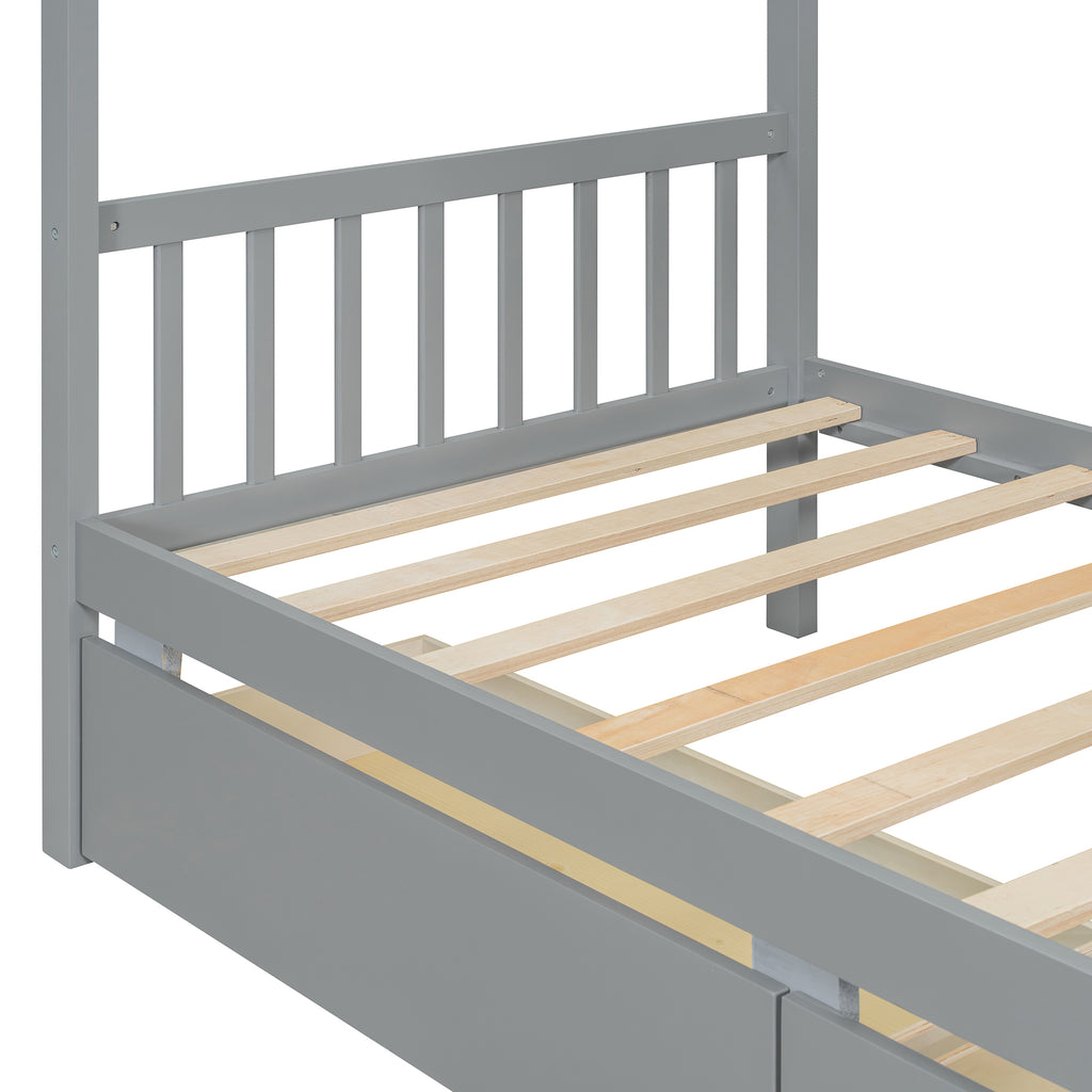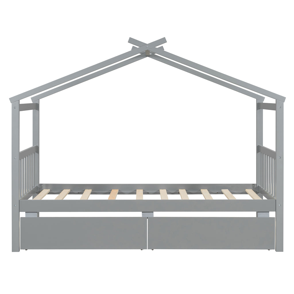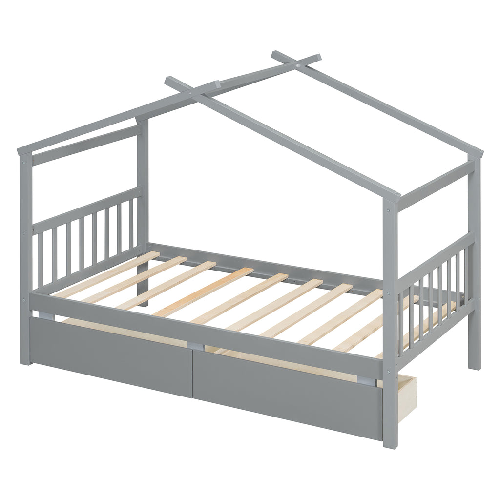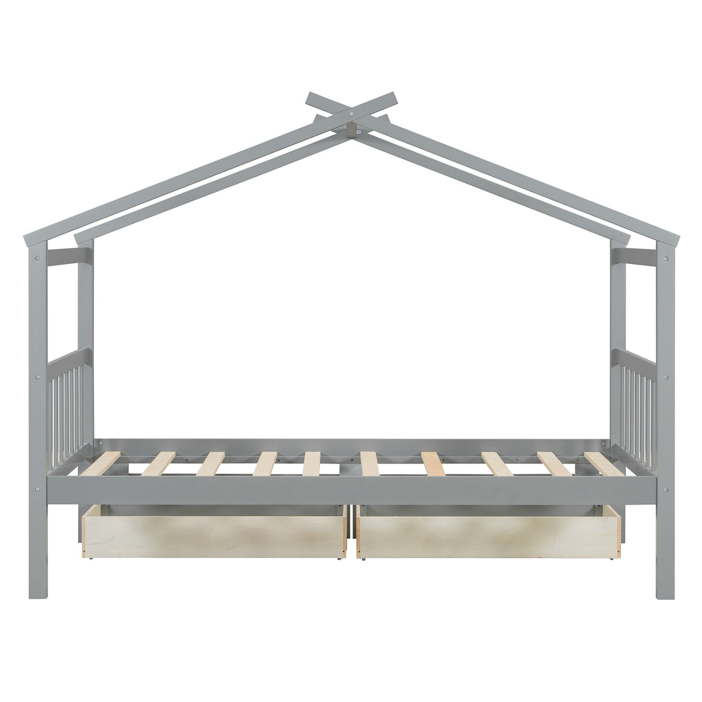 Transform your child's room with this enchanting Twin Size Wooden House Bed, featuring a whimsical house-shaped roof perfect for imaginative play and personal decoration. Crafted from solid pine wood, this durable gray platform bed includes two spacious drawers, offering essential storage to keep rooms tidy and clutter-free. Enjoy peace of mind with its sturdy construction and included headboards, ensuring a safe and comfortable sleeping environment for years to come.