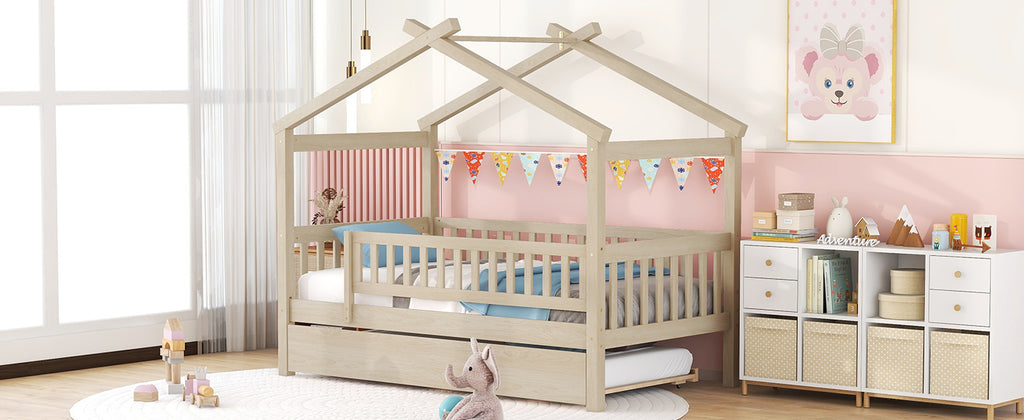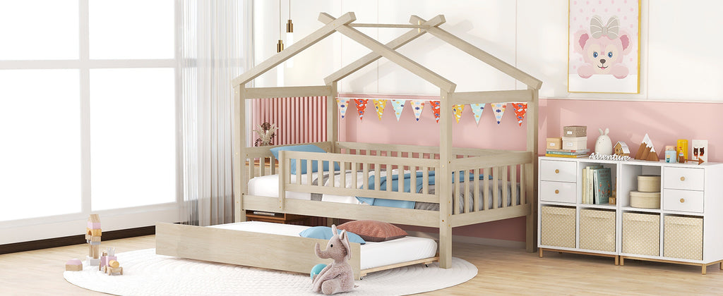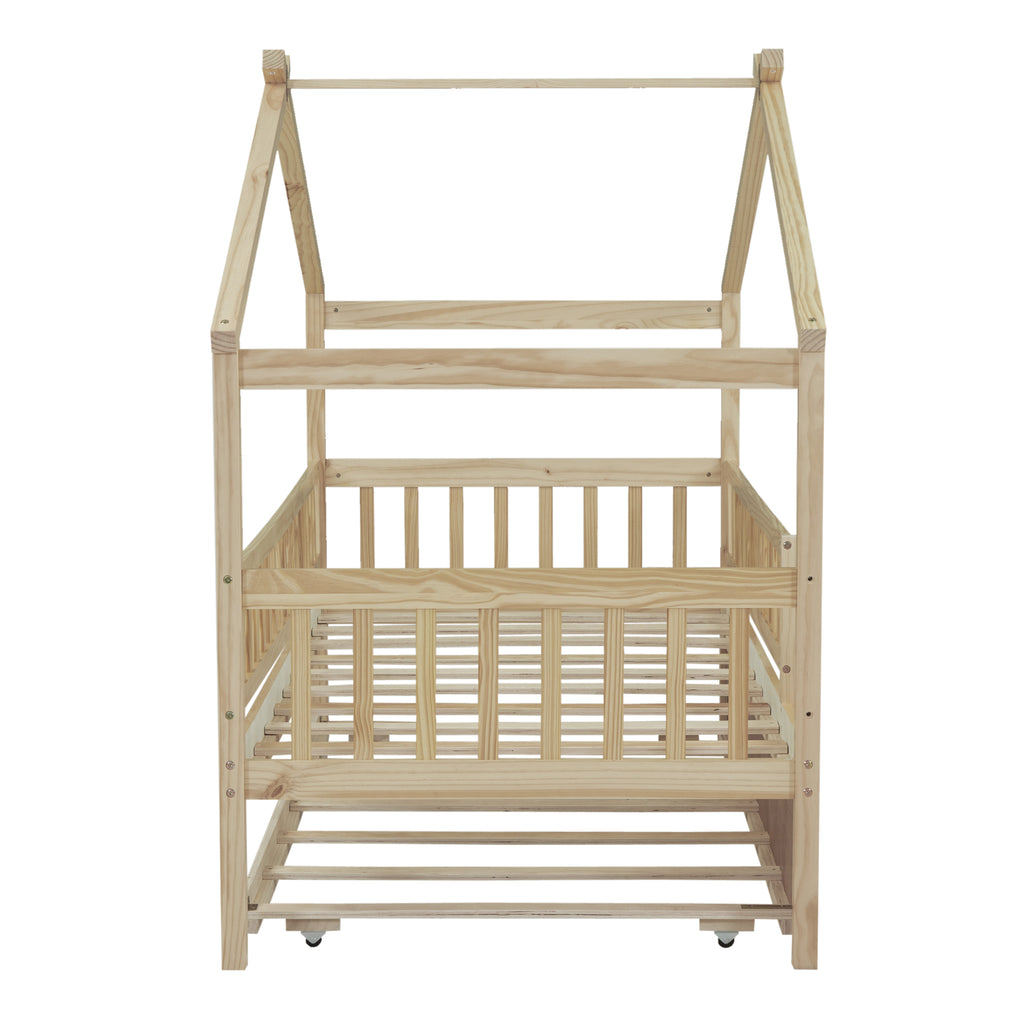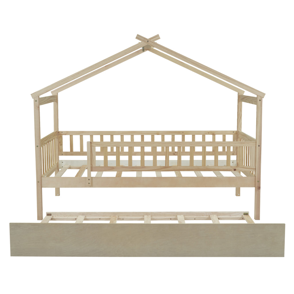 - [Spacious Storage] The wood house platform bed with trundle offer extra sleeping space for sleep-over. Simply just roll out when needed and roll in when it's not in use. It's a perfect space-saving solution to you.