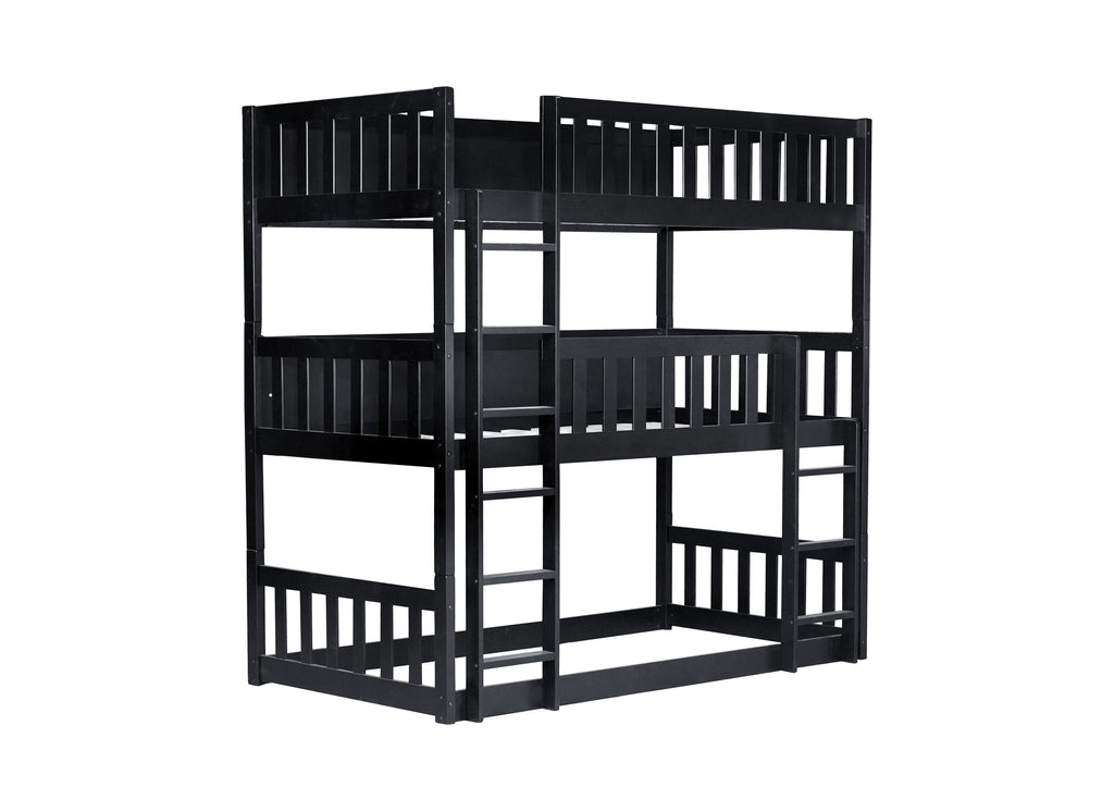 - [Safety and Quality Guaranteed]This bunk bed is mainly crafted from high-quality solid rubber wood and composite wood, providing lasting sturdiness and durability. The two built-in ladders are constructed with firmly secured steps, forging solid stability that ensures the safety while climbing up and down the ladders. The triple bunk features full-length guardrails on the upper and middle bunks which prevent accidental falls.