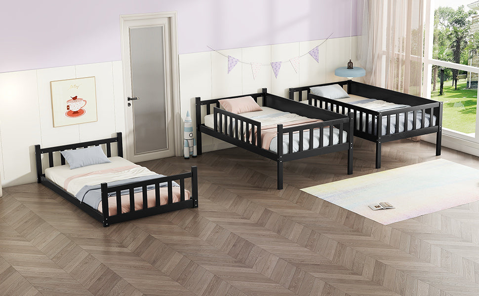 - [Detachable Bed – Strong Adaptability]The triple bunk bed is capable of having multiple variation in how it can be incorporated into the bedroom without sacrificing on comfort or design. The unique detachable feature allows the triple bunk bed to be split into three individual twin beds, offering a more pleasant and cozy atmosphere.