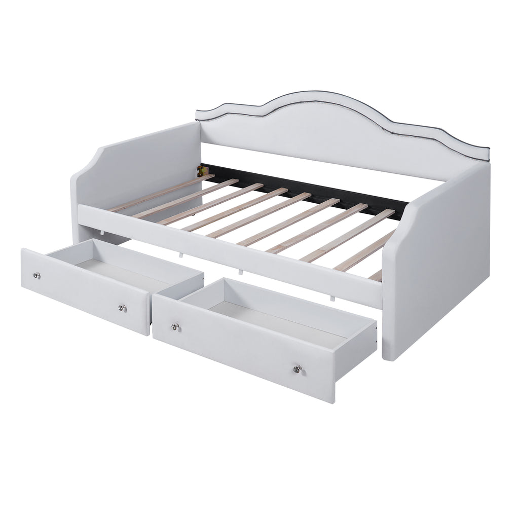 Elevate any child's room with this modern Twin Upholstered Daybed, featuring luxurious beige velvet and a chic curved backrest. Enjoy ultimate convenience with integrated color-changing LED lighting and two practical under-bed storage drawers for a tidy space. Constructed from solid wood and MDF, this sturdy daybed offers both style and functionality, eliminating the need for a box spring.
