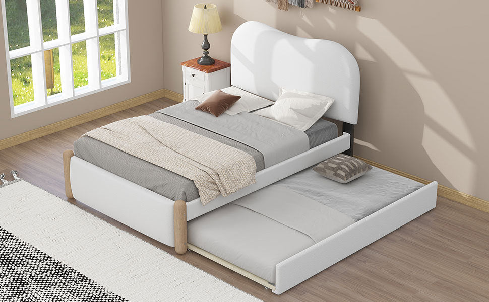 Elevate your bedroom with this stylish Twin Size Upholstered Platform Bed, featuring a cozy Berber Fleece headboard and robust wood construction for lasting durability. Maximizing space, it includes a convenient pull-out twin trundle, perfect for guests, and requires no box spring thanks to its supportive slat system. Enjoy quick assembly and a serene sleep experience with this versatile and elegant white bed frame from Vietnam.