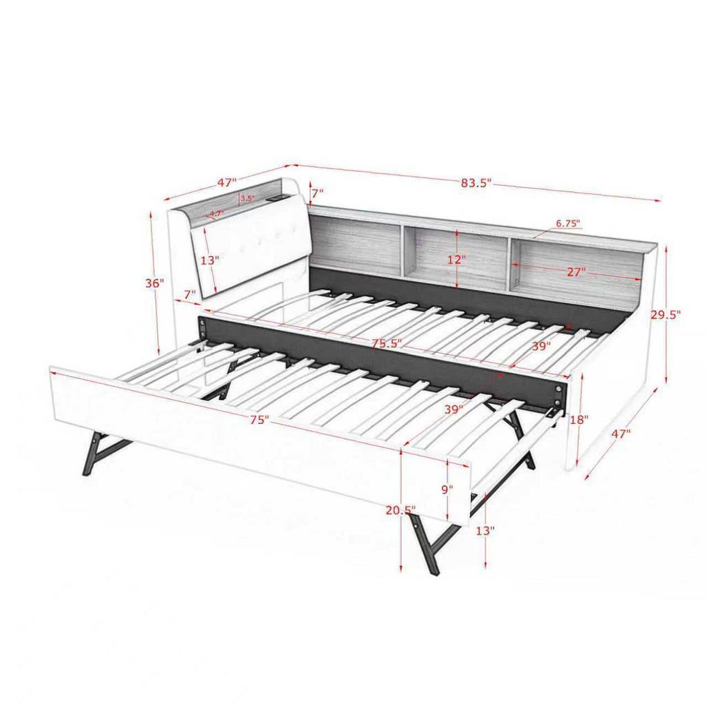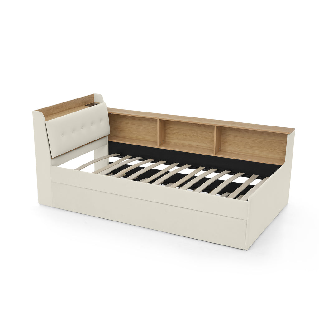 Elevate your bedroom with this contemporary beige velvet twin daybed, featuring an upholstered frame and convenient headboard storage. Discover ultimate functionality with a pop-up trundle, built-in LED lighting, and integrated wireless charging for modern living. This versatile and stylish daybed transforms any space, offering comfort, organization, and a chic ambiance.