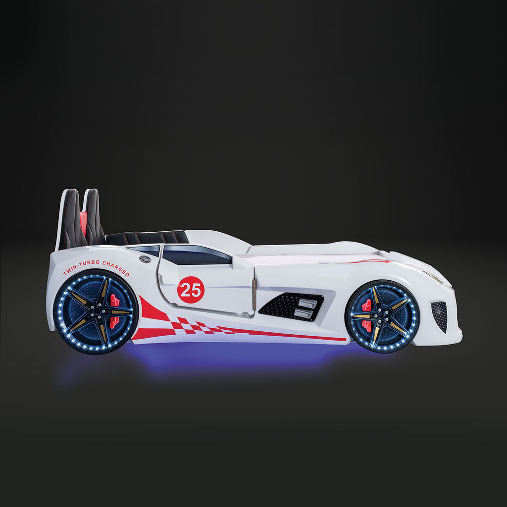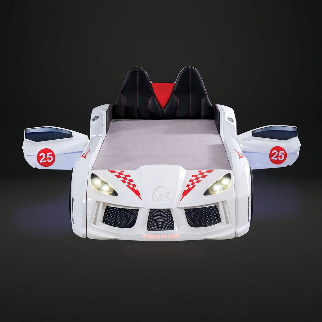 Transform your child's room with this modern white twin race car bed, featuring exciting embedded LED lights on wheels and headlights that double as night lights. Experience immersive fun with four sound options controlled by a wireless remote, plus realistic magnetic opening doors for imaginative play. Designed with a comfortable upholstered headboard and sides, this novelty bed is mattress-ready, making it the ultimate sleep and play haven for any future speed enthusiast.
