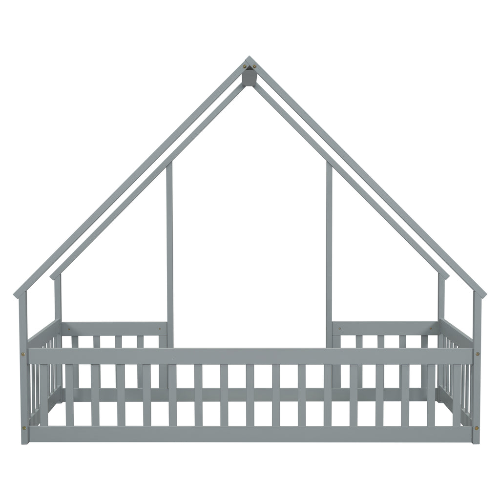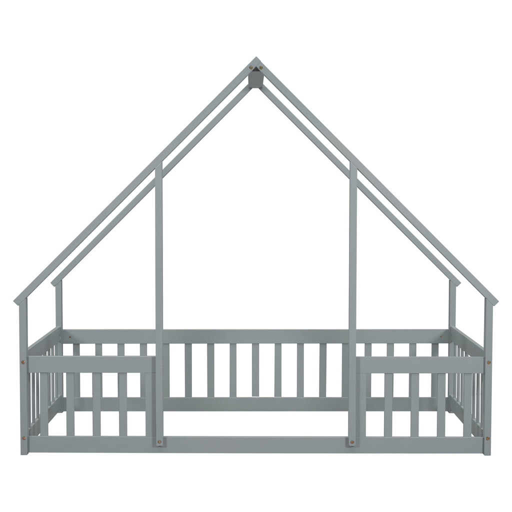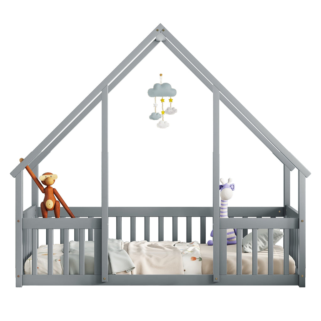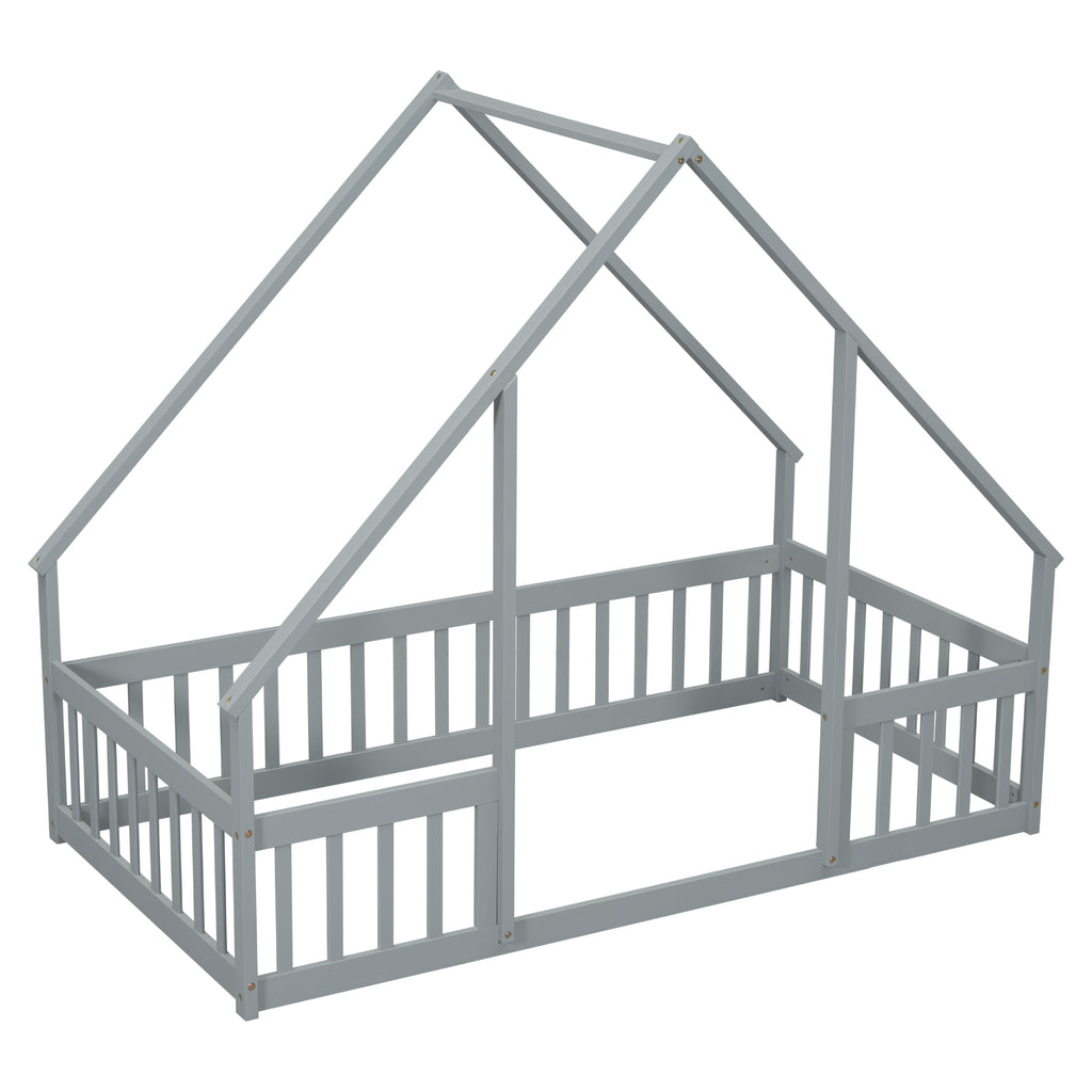 Twin Wood House-Shaped Floor Bed with Fence, Guardrails