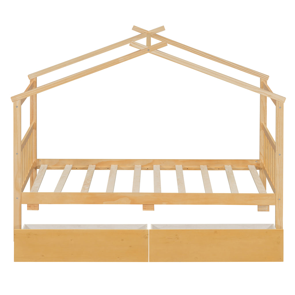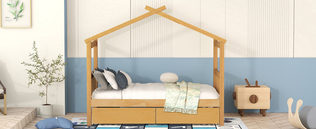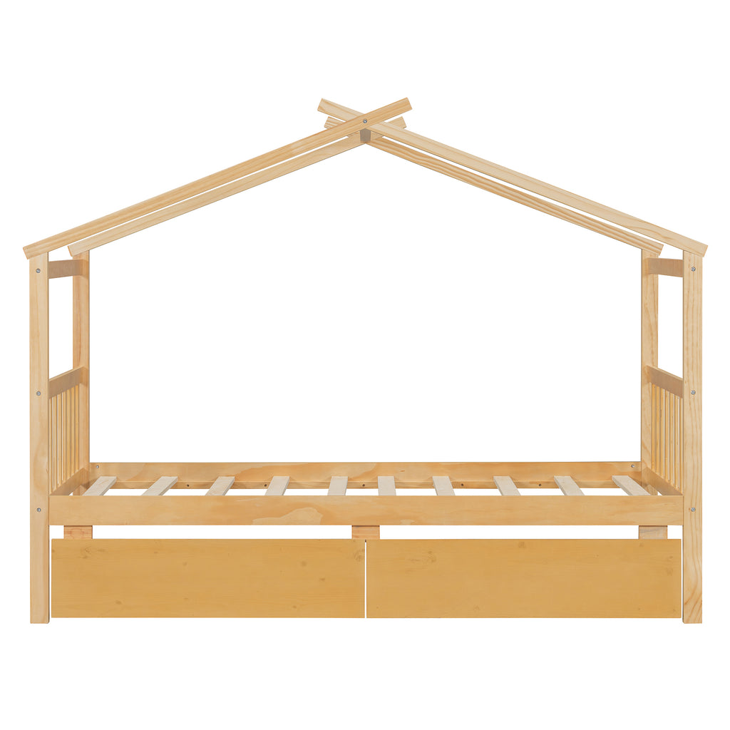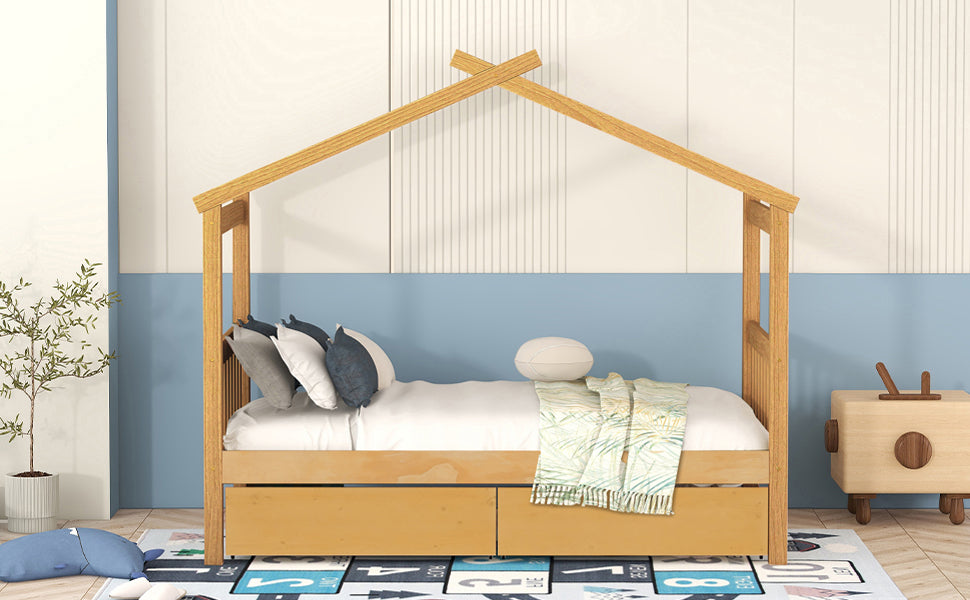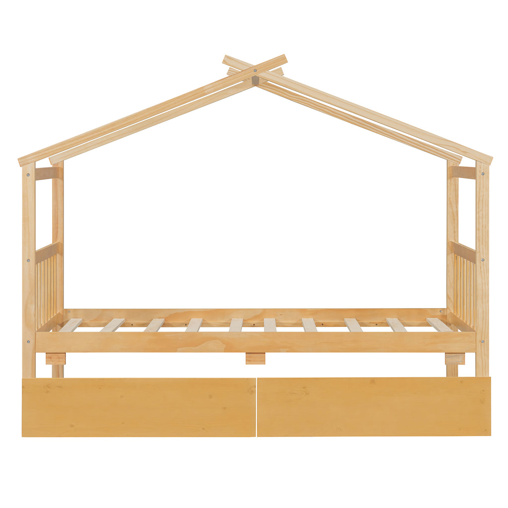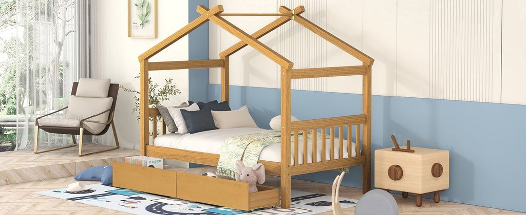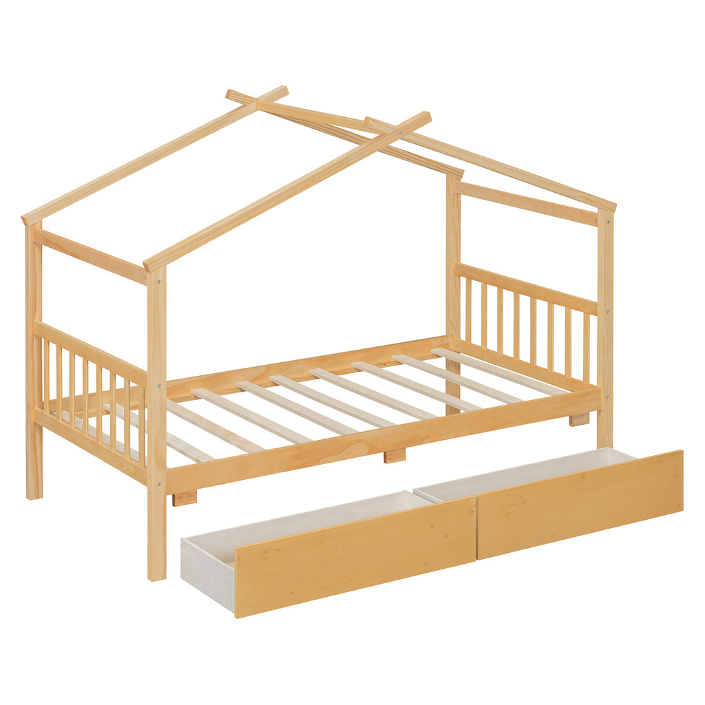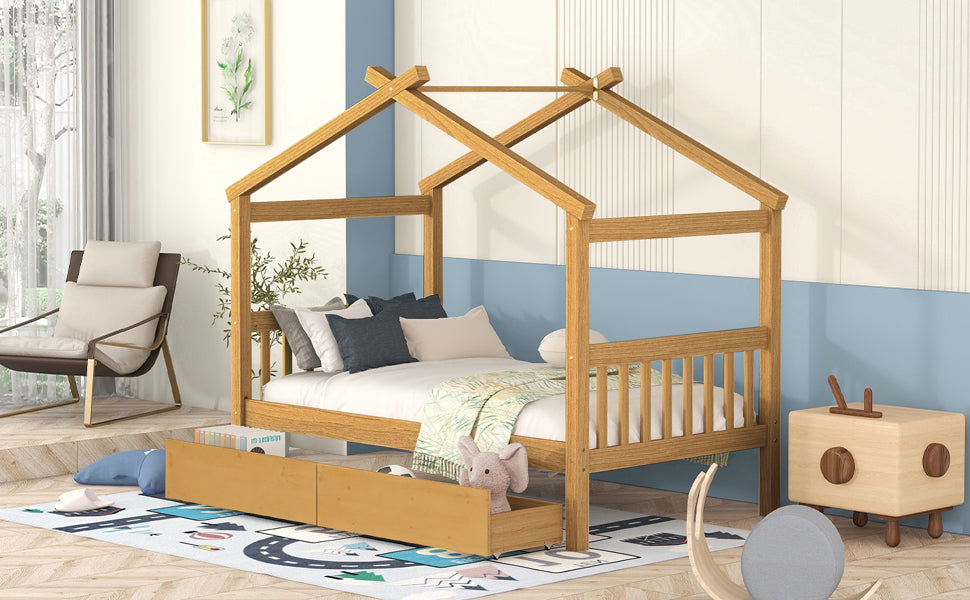 Transform your child's room with this charming twin-size solid wood house bed, featuring a whimsical sky roof for imaginative play. Crafted from durable pine, it includes two spacious drawers, offering essential storage to keep rooms tidy and organized. This creative and practical kids' bed is the perfect space-saving solution, combining fun design with robust construction for lasting enjoyment.