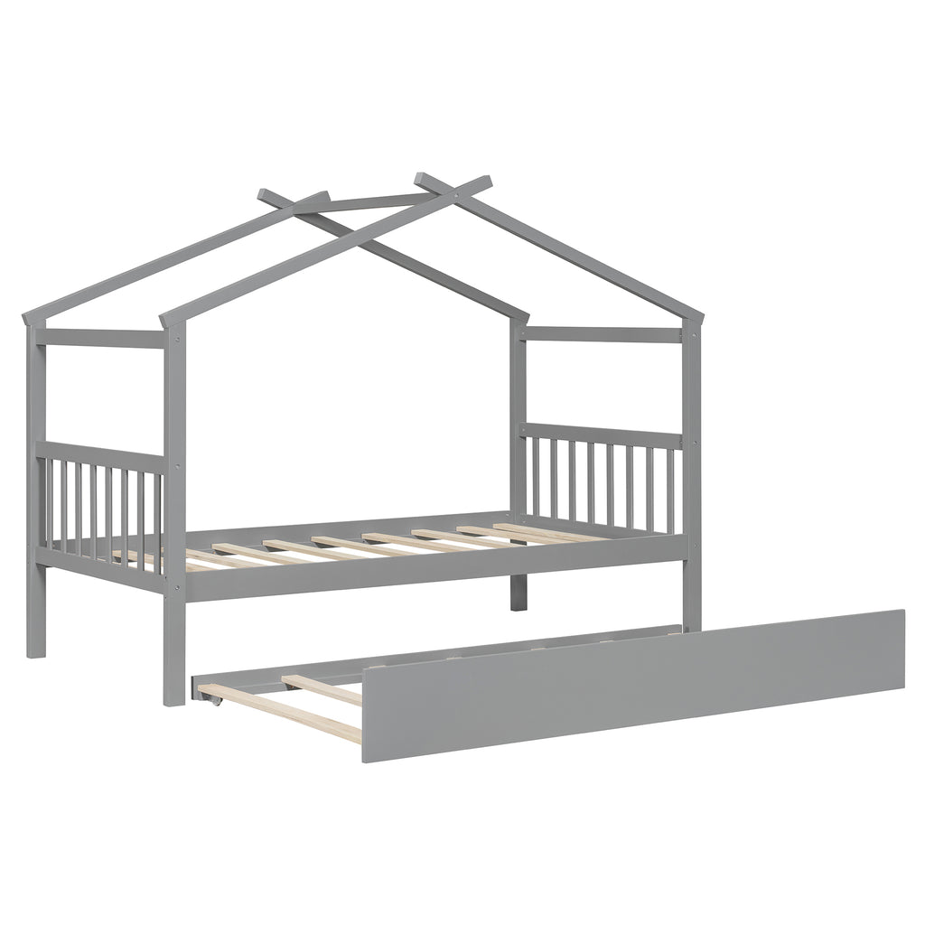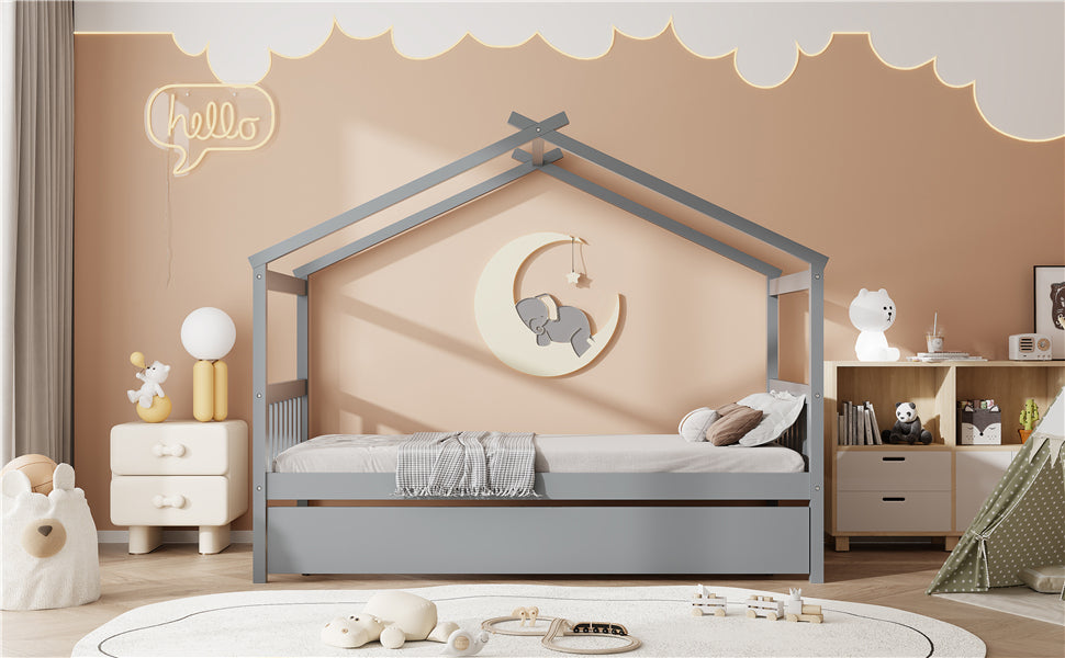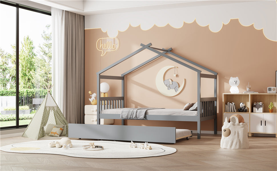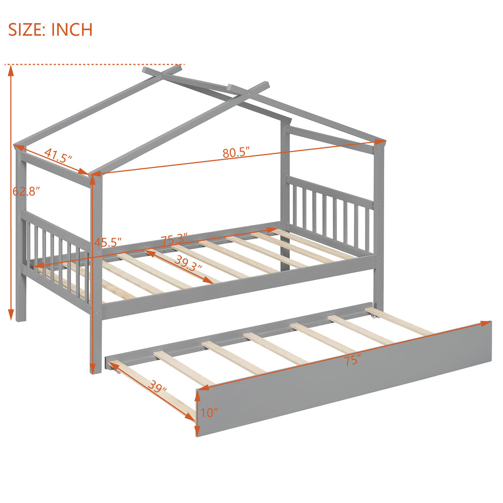 Transform your child's bedroom with this whimsical Twin Size Wooden House Bed, featuring a creative house-shaped design for imaginative play. Crafted from durable solid pine wood, it includes a convenient pull-out twin trundle, perfect for sleepovers and maximizing space. This sturdy platform bed offers exceptional quality and charming style, making it a dream addition to any kids' room.