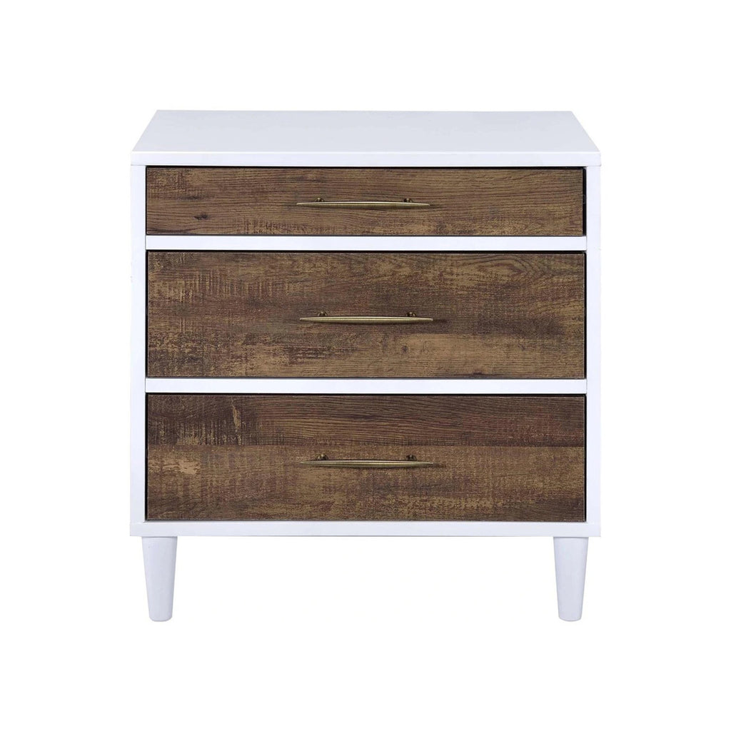 This 3-drawers nightstand brings a contemporary design to your main bedroom or guest room. The nightstand features 3 spacious drawers for storing remotes, coasters, magazines, and other household items. Top it with a lamp or use it to keep your beverage within arm’s reach. Featuring a white frame and weathered oak finish drawer fronts with round tapered legs, the versatile style of this three-drawer nightstand allows it to be a complimentary piece to any bedroom décor.