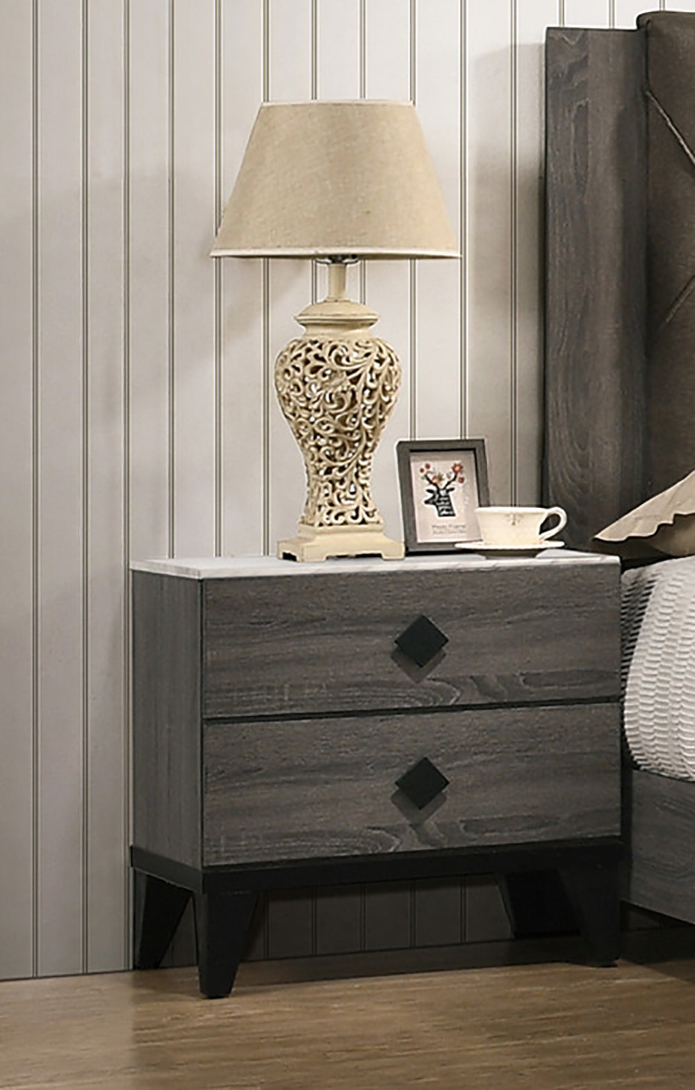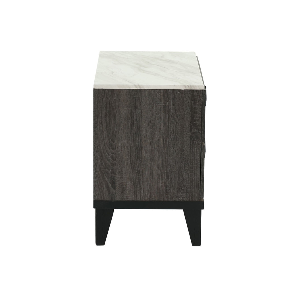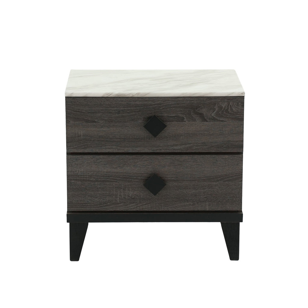 A contemporary take on mid-century modern design, the color blocking from this grey two-drawer nightstand sets it apart from the rest. It features two spacious drawers ideal for all nighttime essentials, including eye wrap and night cream. The top is roomy enough for a chic table lamp and a tablet. Black and special, light drawer pulls curve off the flat drawer fronts in rhombic shape.