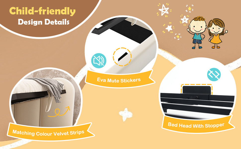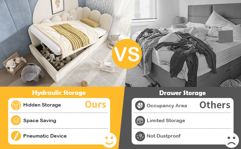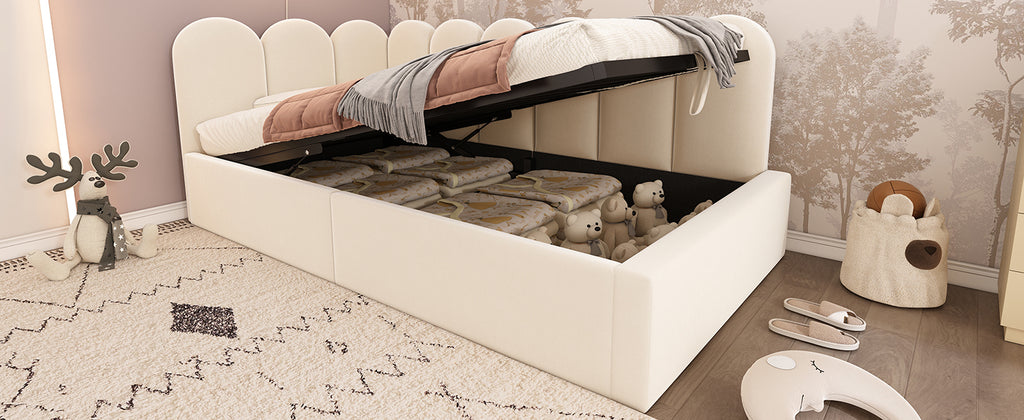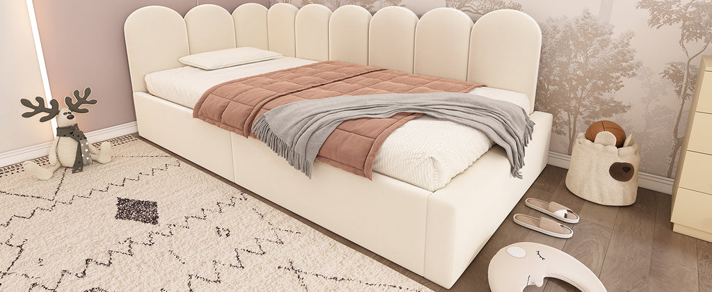 Maximize space with this beige twin velvet daybed, perfect for small rooms and apartments thanks to its innovative L-shaped design. Discover smart, hidden storage with a hydraulic lift, effortlessly keeping your living area tidy and clutter-free. Crafted with luxurious, skin-friendly velvet and a robust metal slatted base, this durable daybed ensures superior comfort and lasting quality.