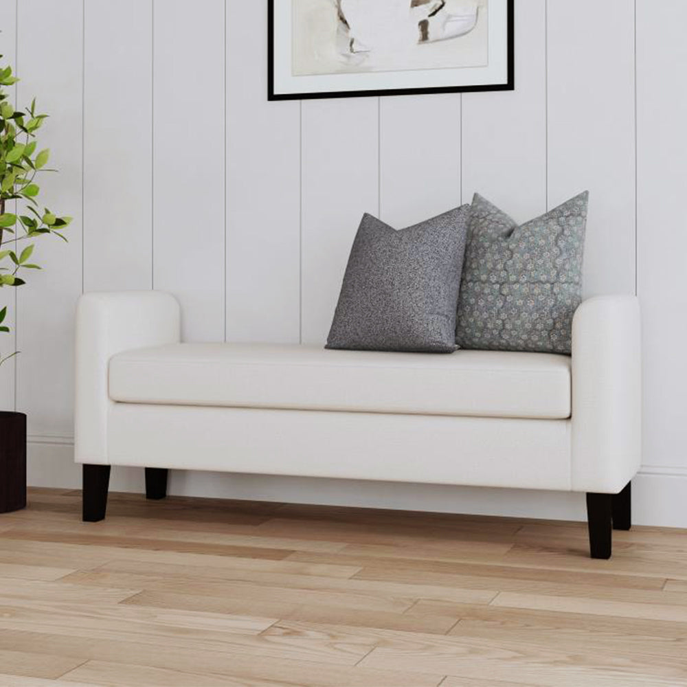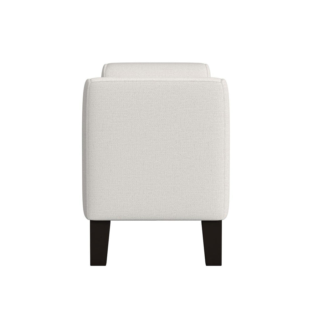 Finishing touches like a modern upholstered bench take your decor from good to great. This bench boasts a backless profile with arms the create a chic, cozy silhouette. The bench seat and frame are upholstered in soft vanilla fabric, creating a neutral palette that brims with elegance. The bench is a charming choice for the foot of your bed or an inviting living area or den, adding seating with a compact footprint. Tall wooden legs receive a black finish to bring the perfect hint of contrast to this striking modern bench.