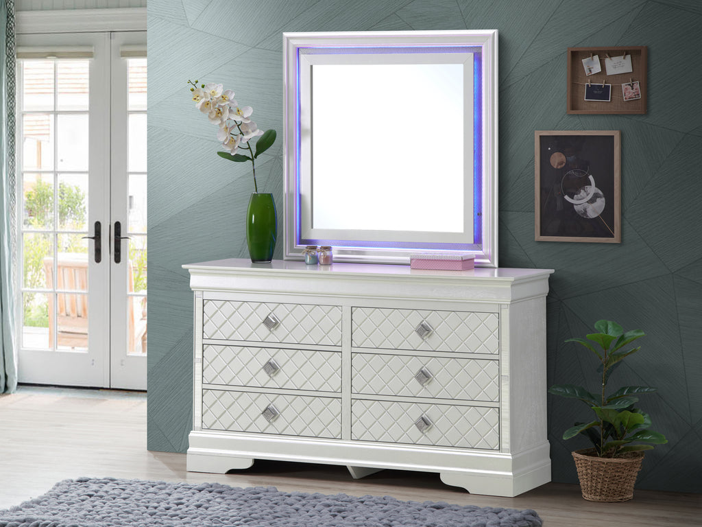 This stunning dresser is designed to enhance your bedroom with its contemporary appeal and functional features. The eye-catching silver champagne finish enriches your space, providing a stylish focal point that complements various decor themes.