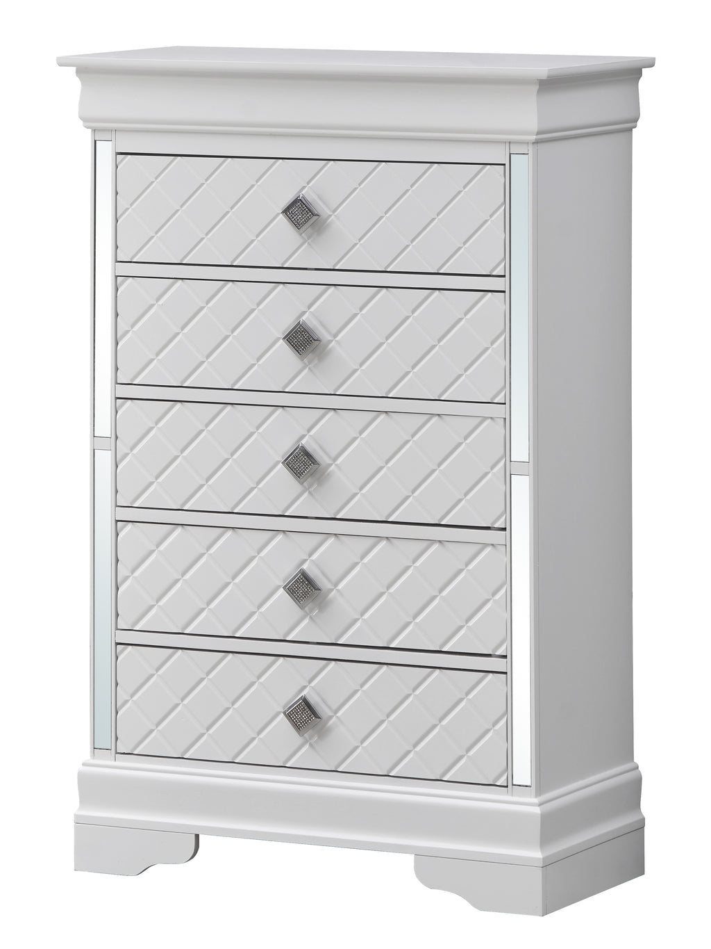 The Silver Champagne Chest elevates your bedroom with its striking silver champagne finish, infusing each corner with modern elegance and charm. This stunning piece features an eye-catching embossed ''X'' pattern that enhances its contemporary feel, setting the stage for a stylish environment.