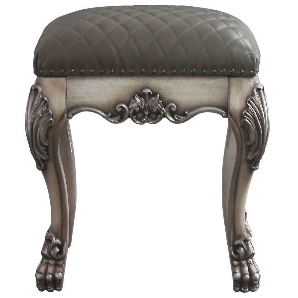 This stool showcases a grey faux leather upholstered seat cushion for a striking visual contrast, paired with vintage bone-white finished claw legs that exude sophistication and charm. Its versatile design complements various vanity styles, while the sturdy wooden scrolled apron construction ensures stability and enhances its elegant appearance.