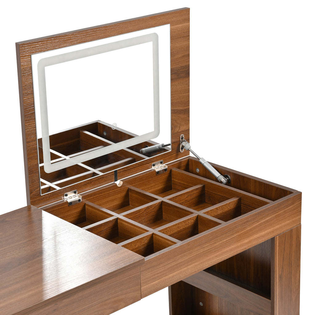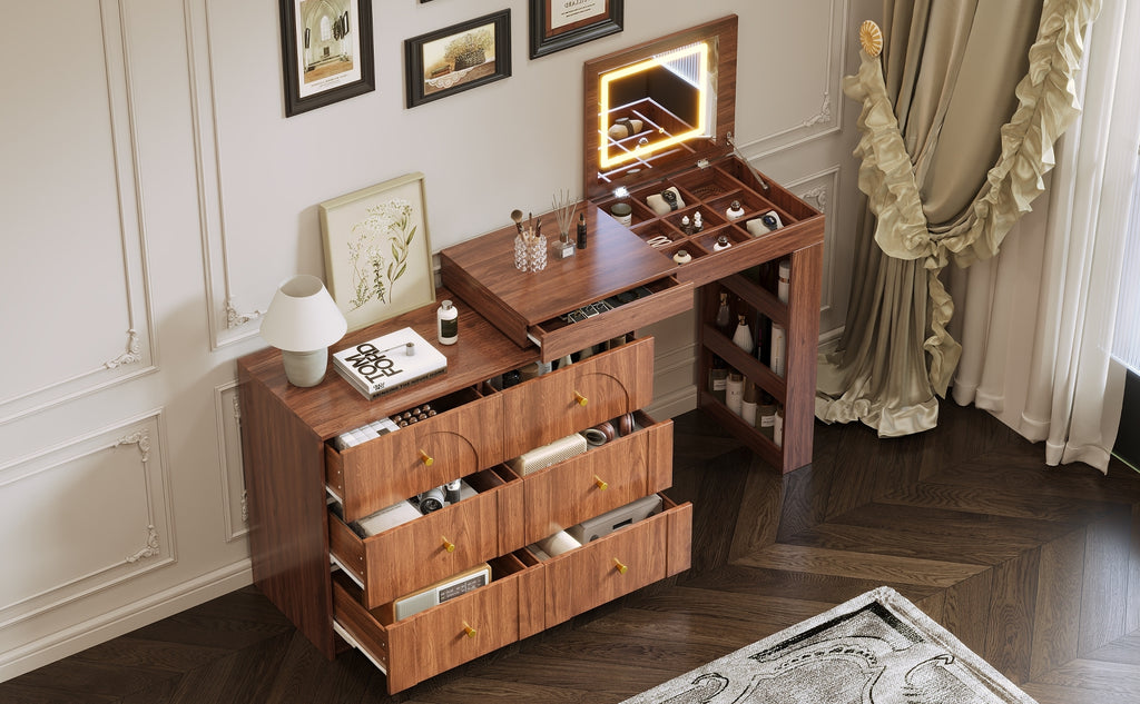 - 1.Vanity Desk with Flip-Top Tabletop: With a flip-top design on the right side, this vanity desk allows you to easily switch between beauty time and work mode. Simply open the top when you’re ready to do your makeup, and you'll find a built-in mirror along with 9 thoughtfully designed compartments to neatly organize your cosmetics and accessories. When closed, the flat surface becomes a spacious tabletop, perfect for placing daily essentials, writing, or working on your laptop.