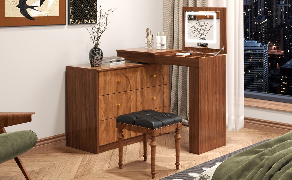 This vanity desk features a space-saving flip-top design, allowing you to switch effortlessly between a makeup station and a writing or work desk. It comes with a built-in LED mirror offering 3 adjustable brightness levels to suit your needs. With multiple drawers, storage compartments, and shelves, this vanity provides ample storage space for all your beauty and work essentials.
