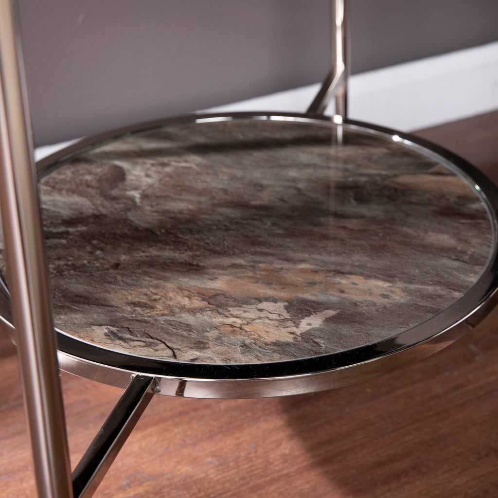 - A convenient drawer tucks away odds and ends to keep them organized and out of sight,while a faux marble display shelf houses décor pieces or your favorite reads