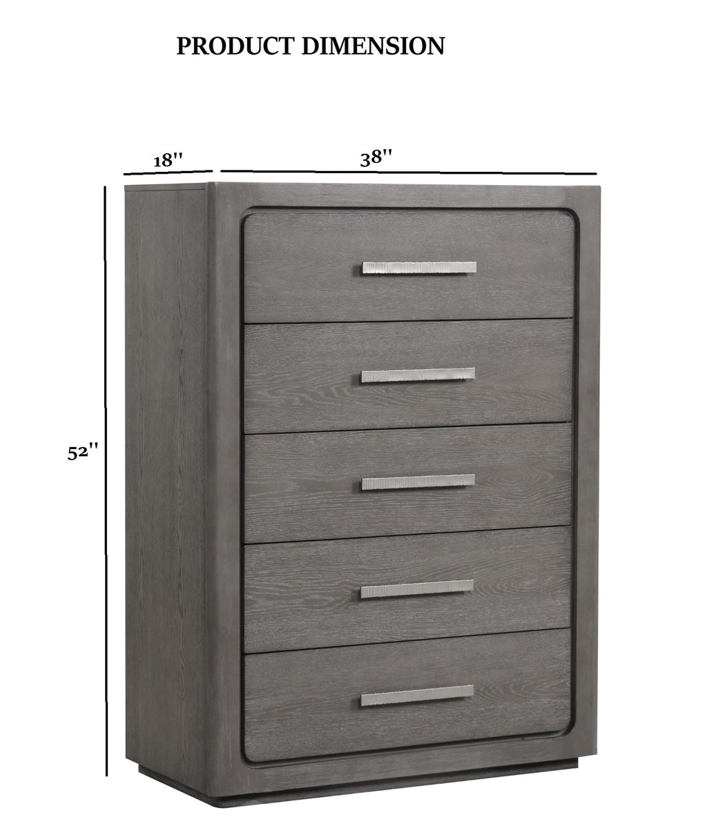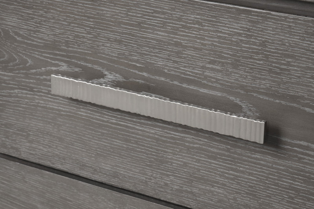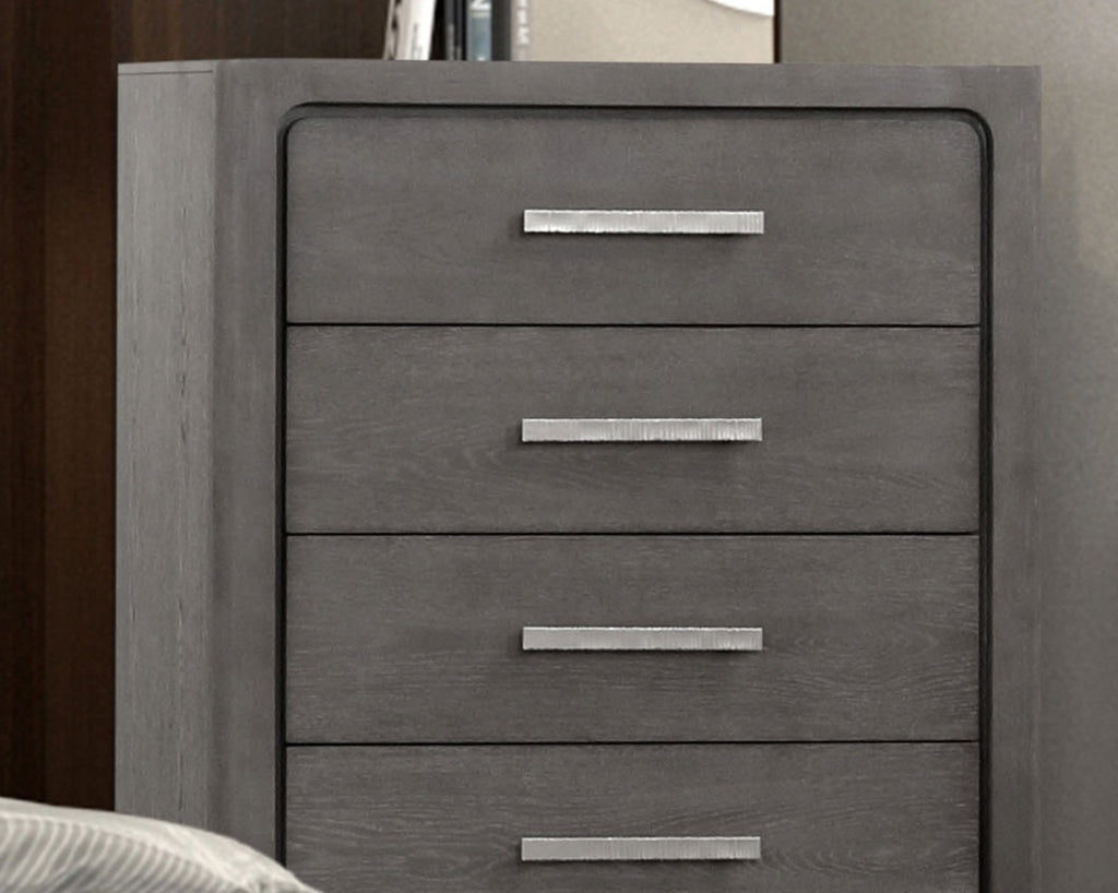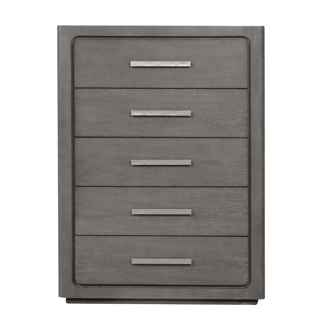 Boasts a contemporary design wrapped in a warm grey finish, lending a sleek and luminous aesthetic to any bedroom. Boasts a contemporary design wrapped in a warm grey finish, lending a sleek and luminous aesthetic to any bedroom. Accented with heavy-duty nickel hardware, combining form and function elegantly.
