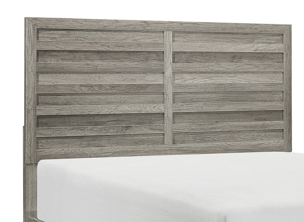 The modern lines of the Mandan Collection are blended with transitional aesthetic to create a unique offering for your bedroom. Utilizing faux wood veneer creates the look of authentic wood planks with the gray finish further lending to the rusticated style of the Queen size bed.