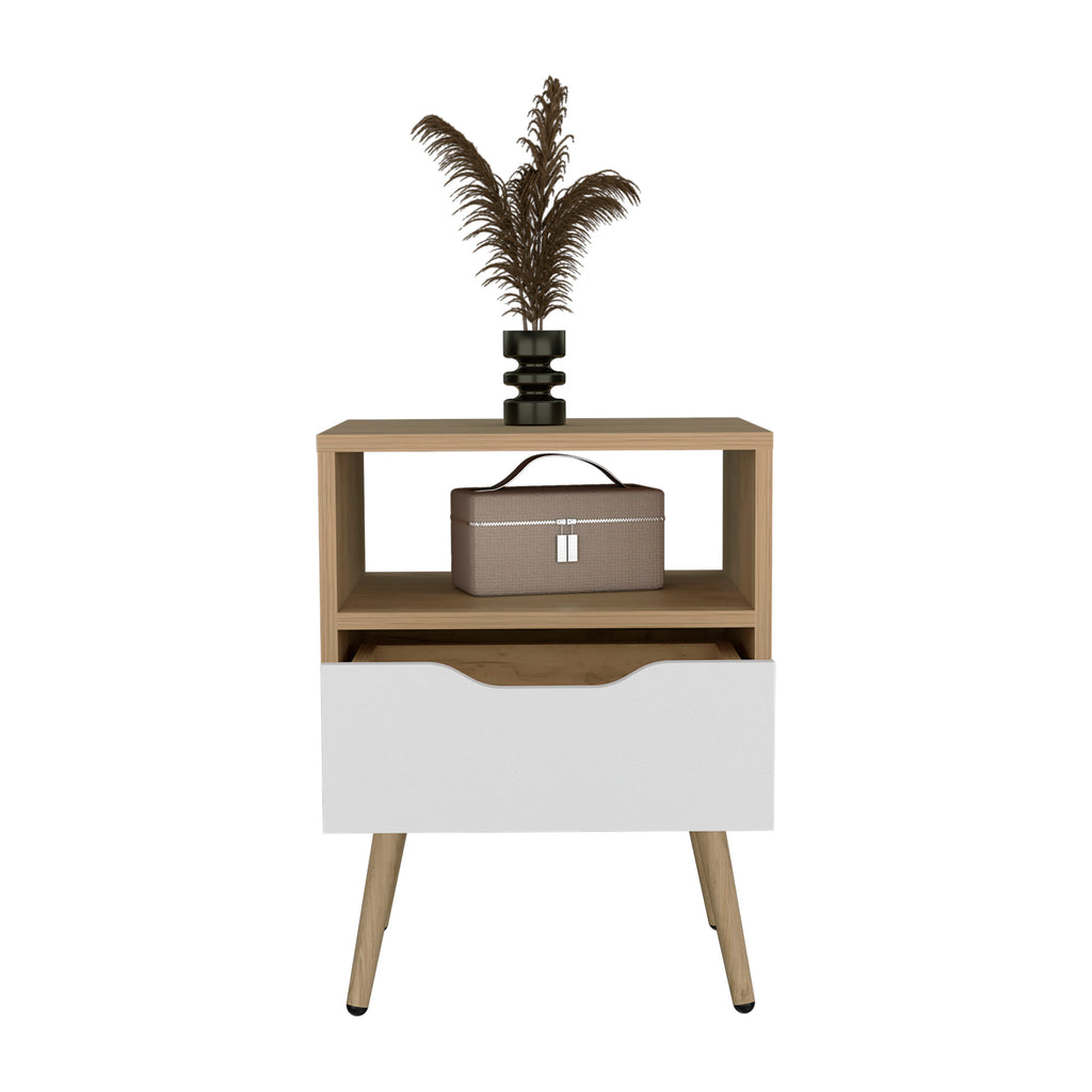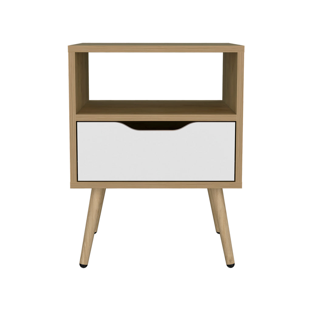 - Two-tone design blends natural oak and crisp white for a warm, modern aesthetic.