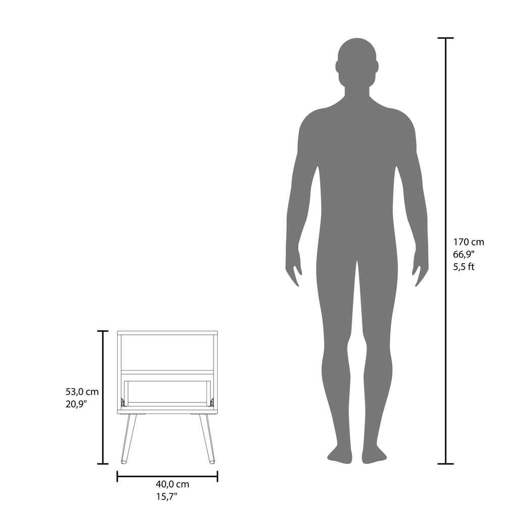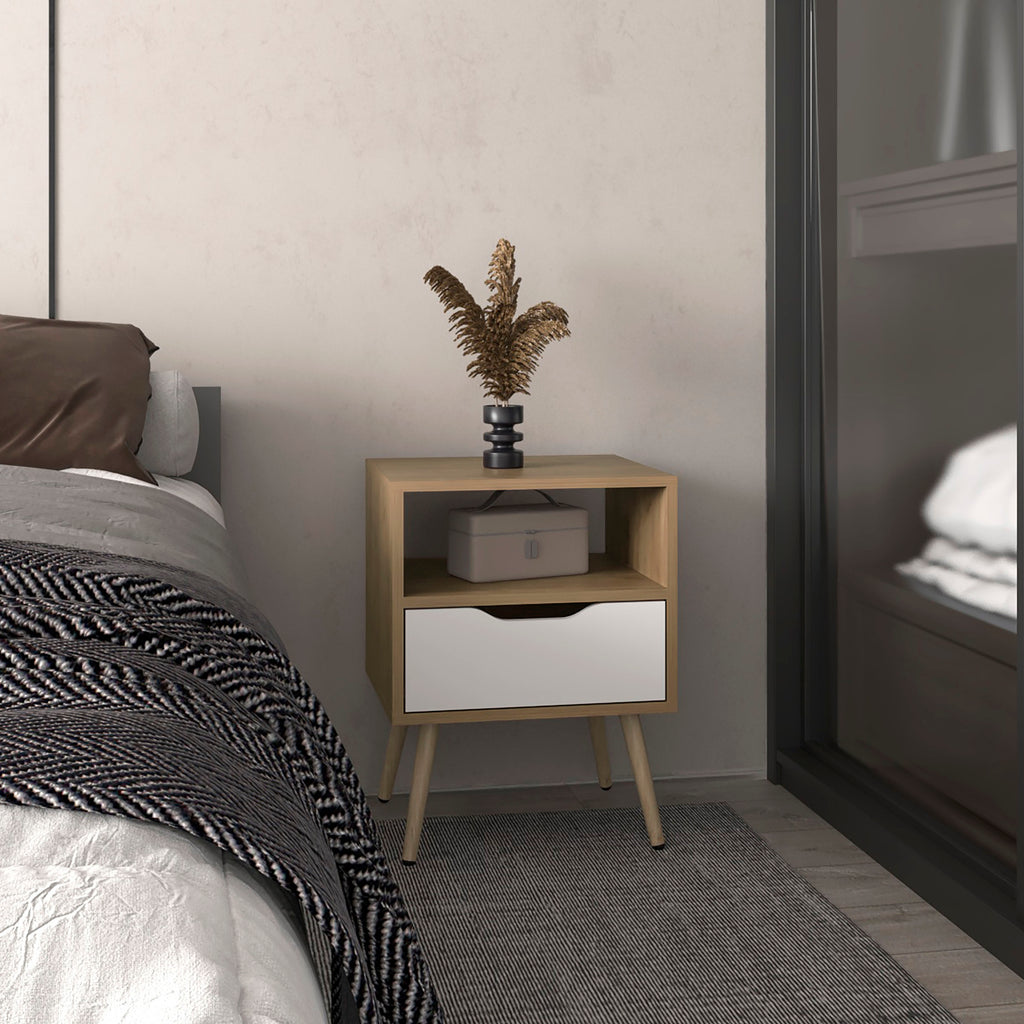 - Single drawer with sleek handle offers discreet storage for personal items and bedside essentials.