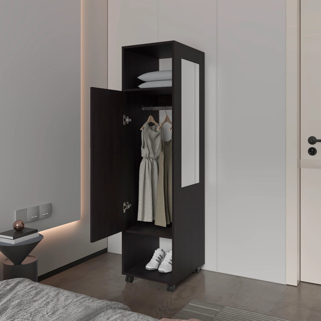 This stylish closet features open storage for easy access to clothing and accessories, while an integrated mirror adds practicality and saves space. With a door for concealed storage and a sleek, modern design in melamine, it seamlessly blends into any décor, making it an essential addition for organization and style in any bedroom.