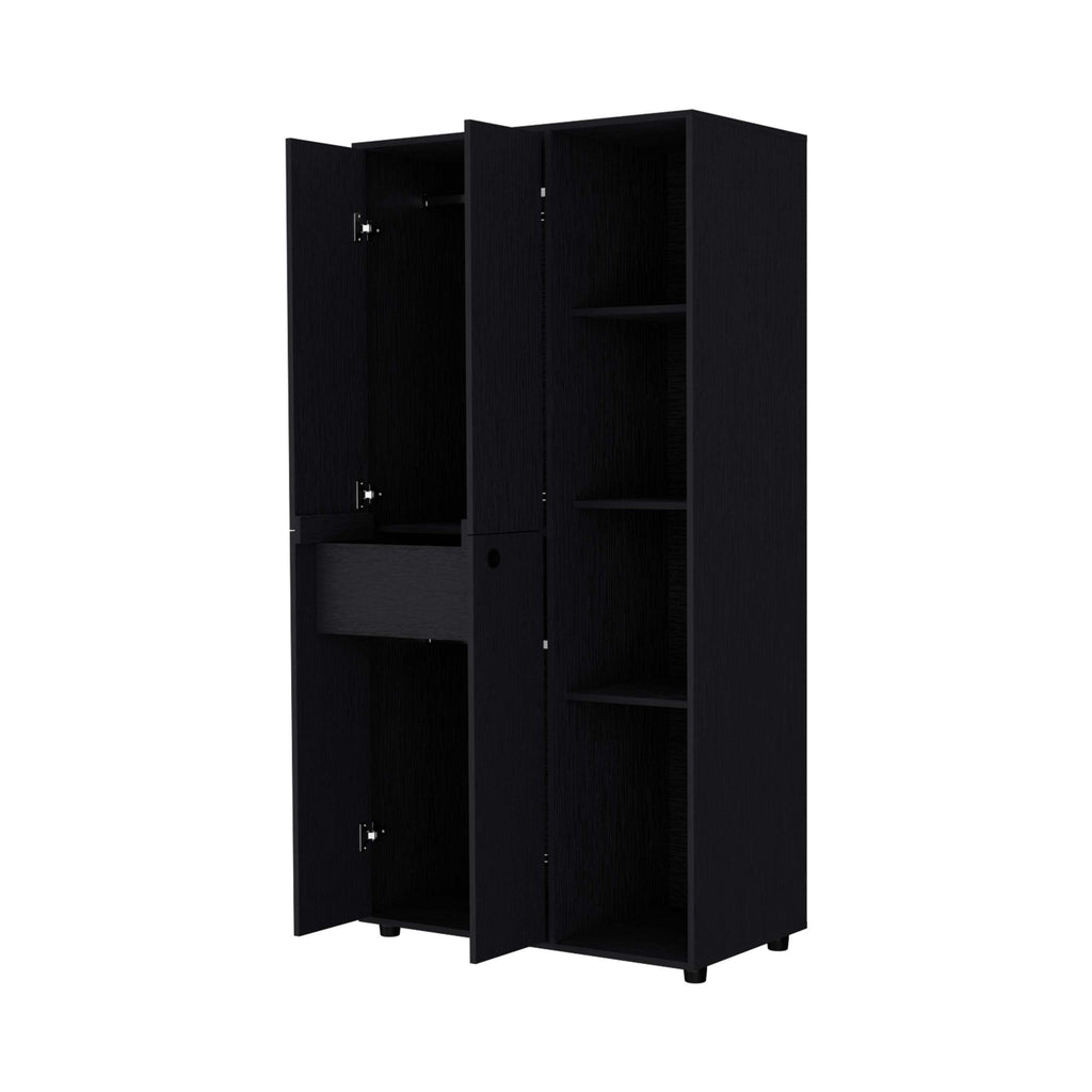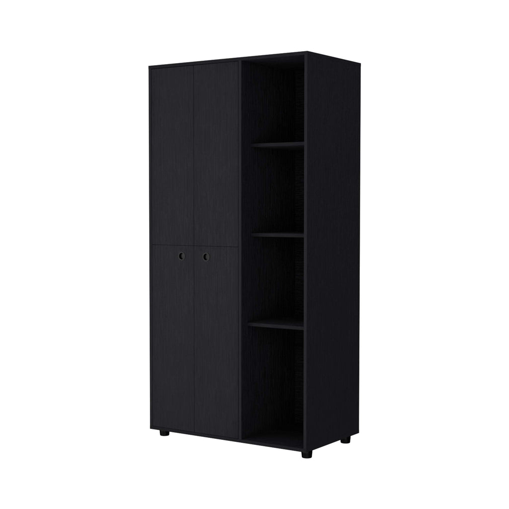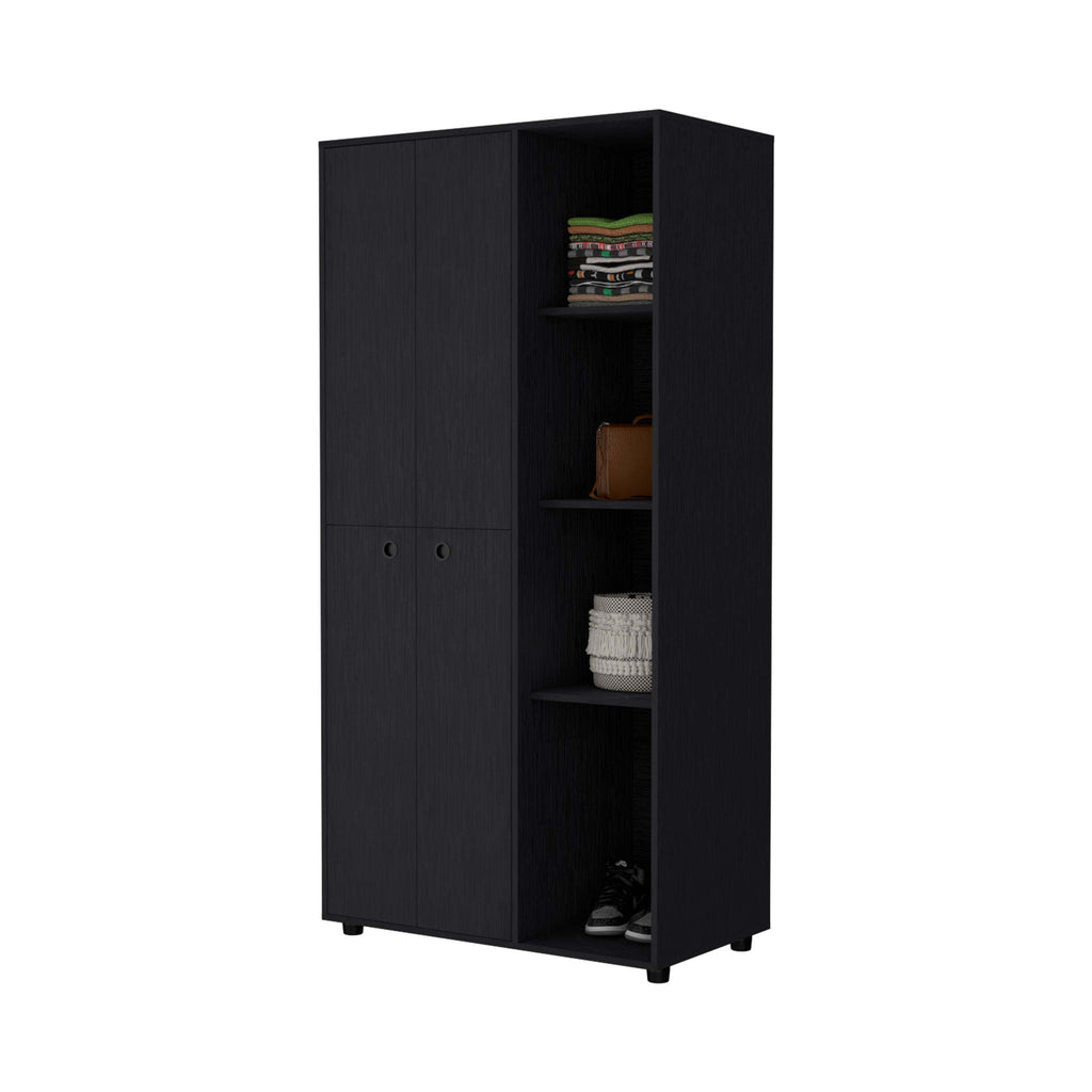 With its slim design featuring four doors, two hanging rods, four open storage cabinets, this armoire offers ample storage while complementing your style with options in white or black manufactured wood finishes. Perfect for small spaces, this armoire provides efficient organization without sacrificing storage capacity, making it an ideal addition to any room.