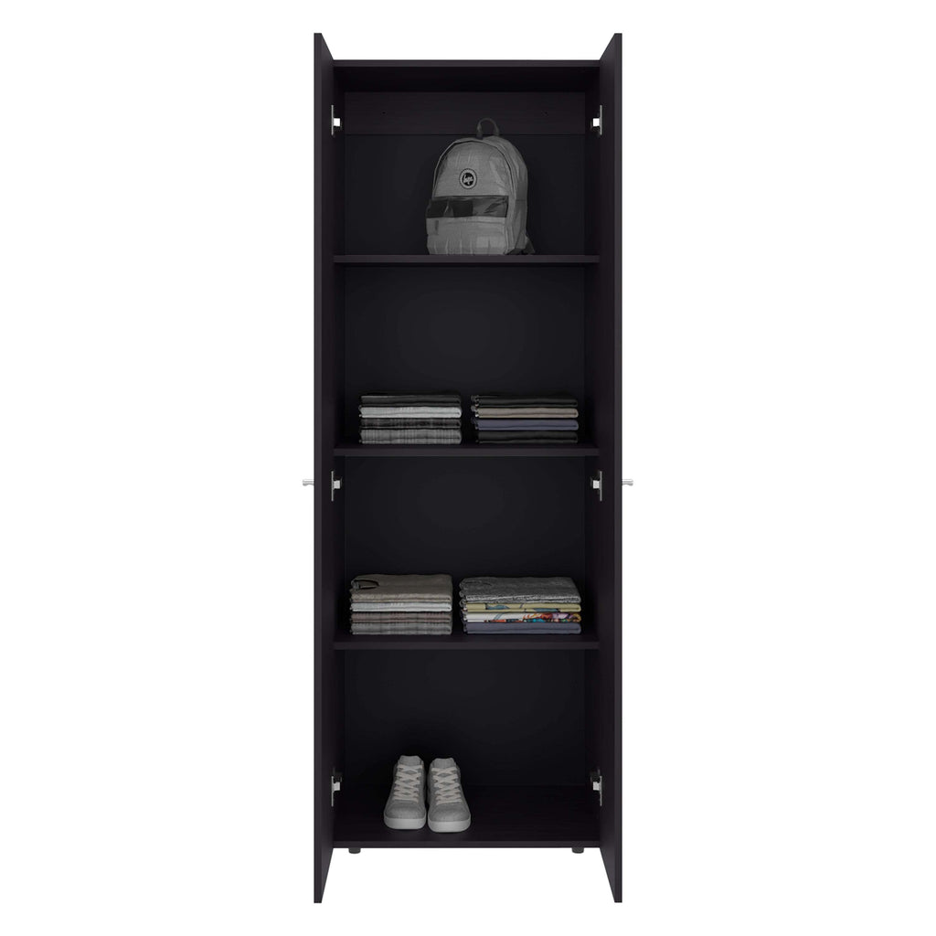 Featuring a bright, clean finish, the Wenge Wardrobe Cabinet adds a refreshing touch that enhances room brightness and complements diverse décor styles. Its vertical storage design with four shelves and a two-door configuration maximizes space efficiency while providing organized, easily accessible compartments suitable for both compact and larger rooms.