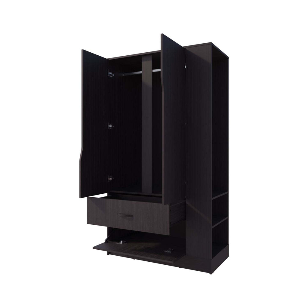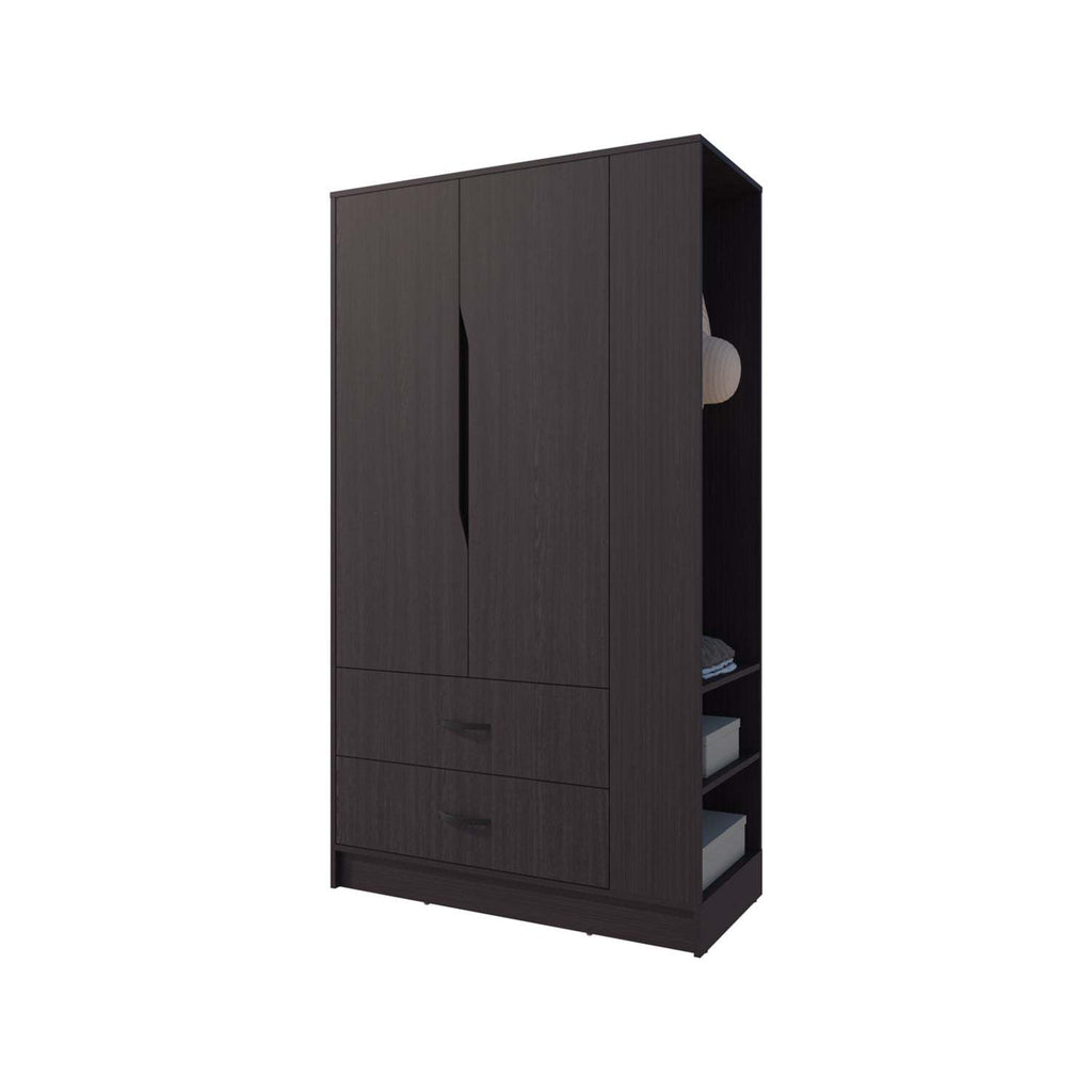 Designed with three doors, a drawer, and an open side shelf, the wenge wardrobe provides ample storage and display options to suit daily needs. Its durable build with a deep wenge finish elevates bedroom interiors while ensuring clothing remains neatly organized and wrinkle-free.