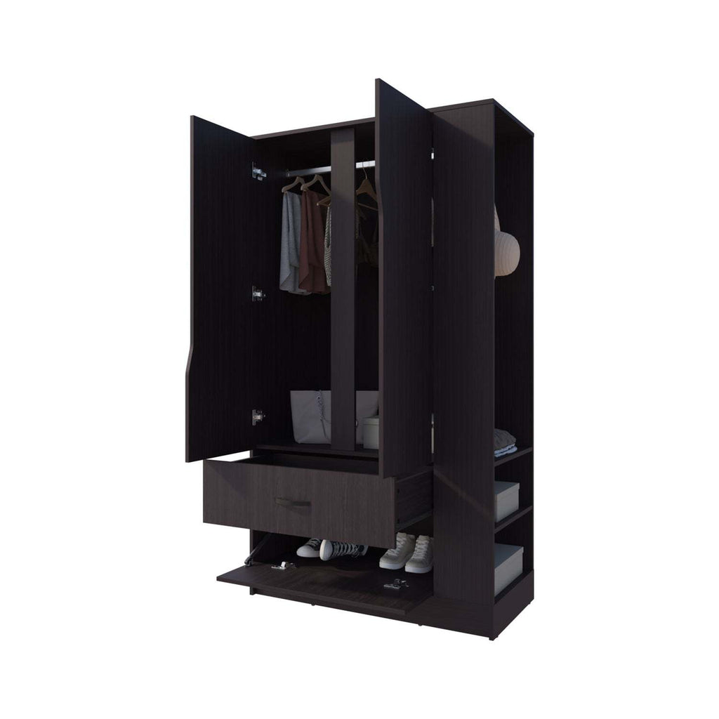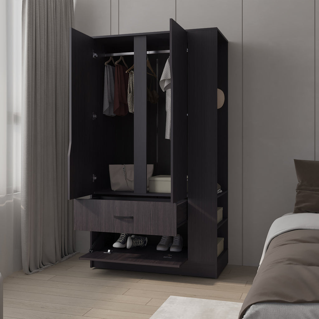 - Wenge wardrobe features three doors and one drawer, providing ample enclosed storage space for clothing and accessories